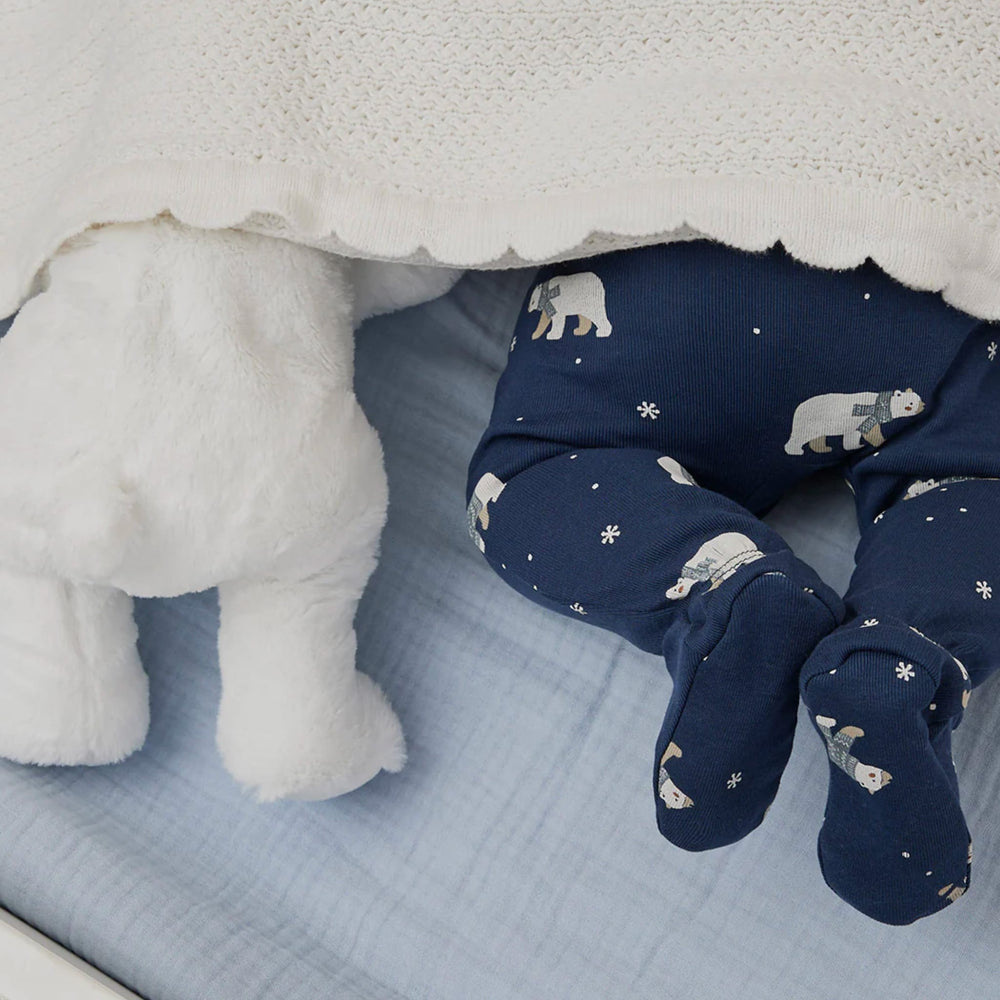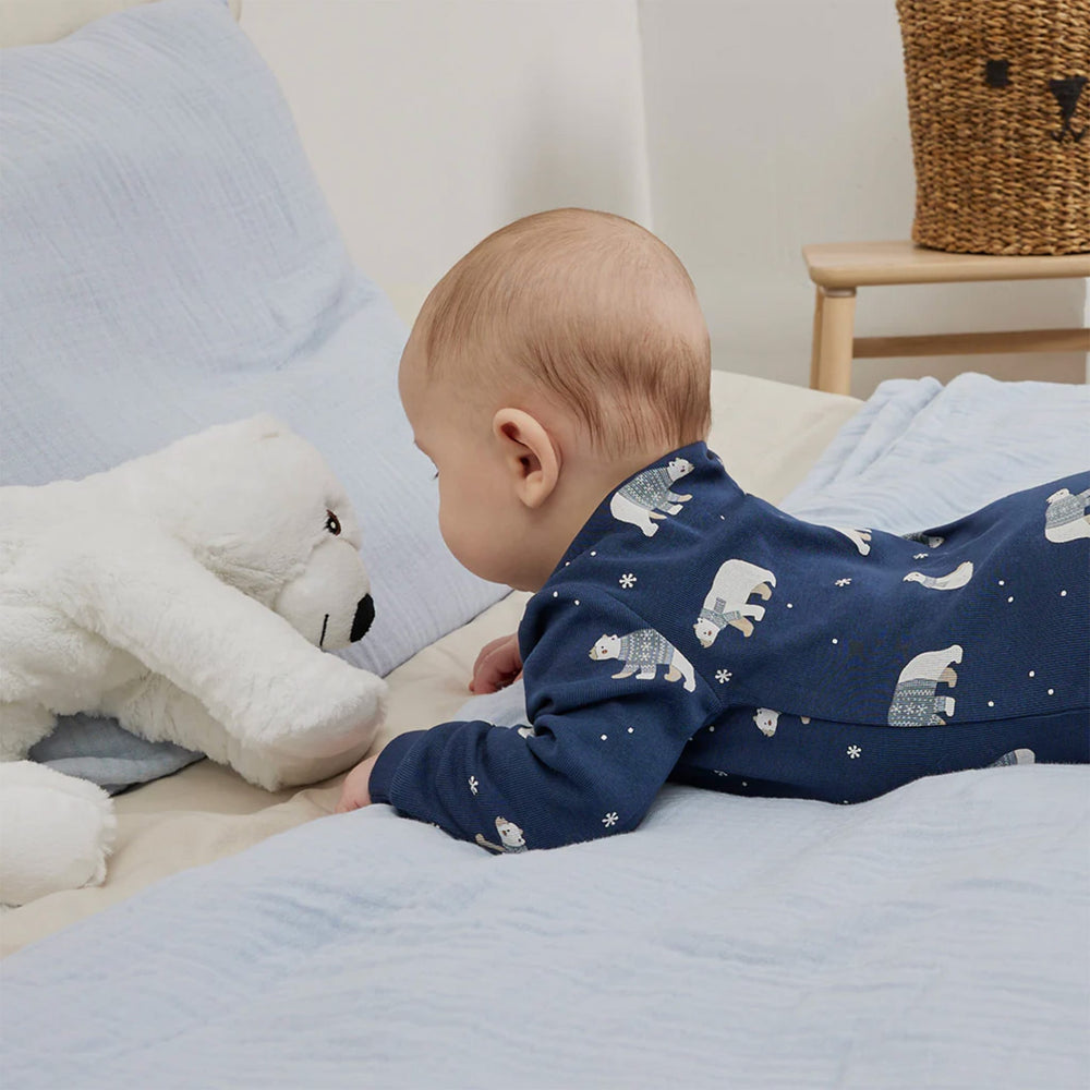 Snuggle up for the bedtime routine with your littlest polar bear before another snow day tomorrow. This navy sleeper features a cozy Winter Polar Bear print which coordinates perfectly with the pyjamas in the same range for older siblings. Made from organically grown cotton rib, the sleeper keeps them at just the right temperature throughout the night while the two-way zip makes for easy changing.