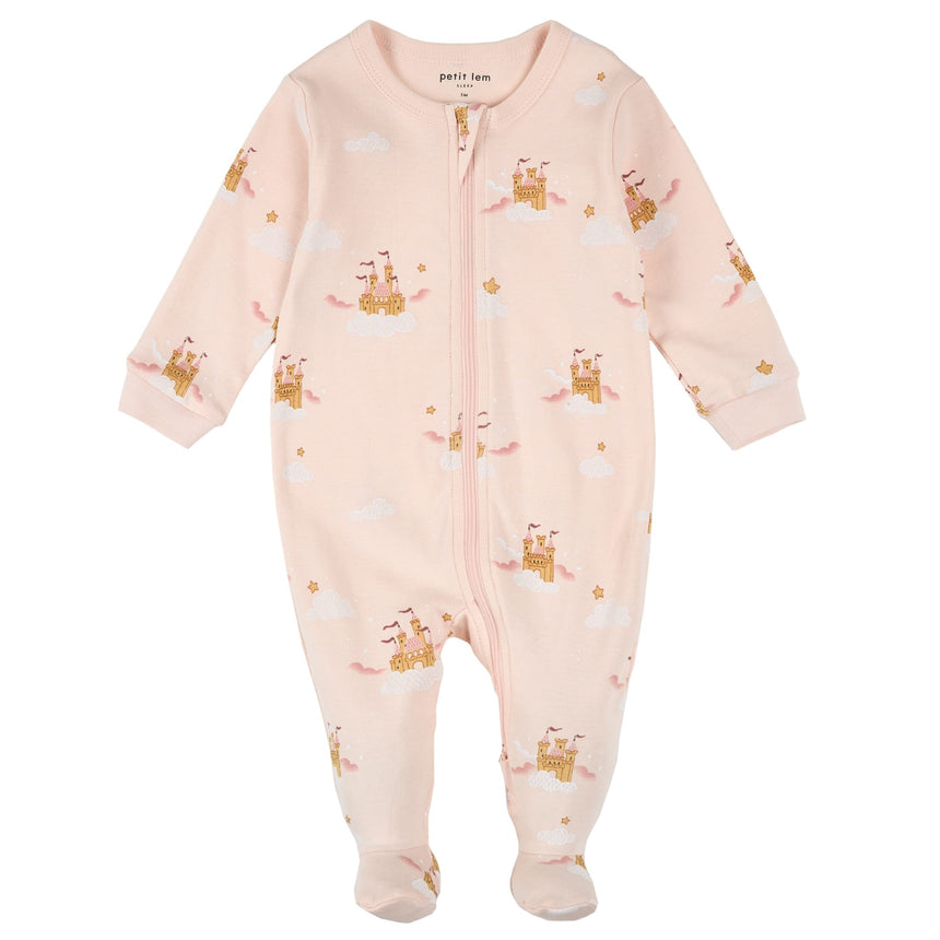 Let their imagination run wild with this Magic Castle print sleeper and a few bedtime stories. Made with organically grown cotton rib, the pink one-piece has a delicate and soft feel, making bedtime extra dreamy. Integrated feet keep her tiny toes snug while the ribbed cuffs allow her to explore her magical surroundings. There’s matching PJs for big sisters so they can snuggle up and enjoy a story together.