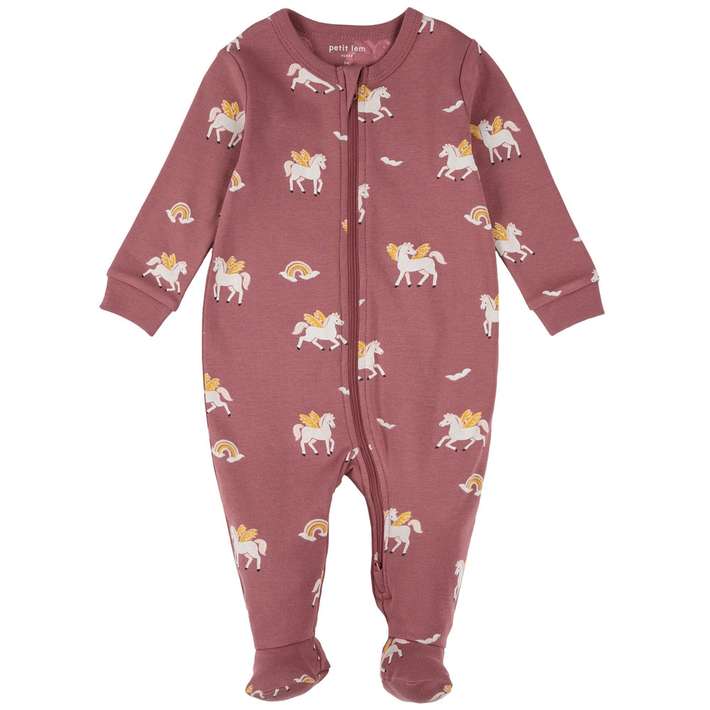 Fly her off to dreamland with this cozy Rainbow Pegasus sleeper. With a magical design, and created with ultra-soft organically grown cotton rib, the sleeper is bound to be a bedtime favorite. Cozy integrated feet, ribbed cuffs and a two-way zip make the one-piece as practical as it is adorable.