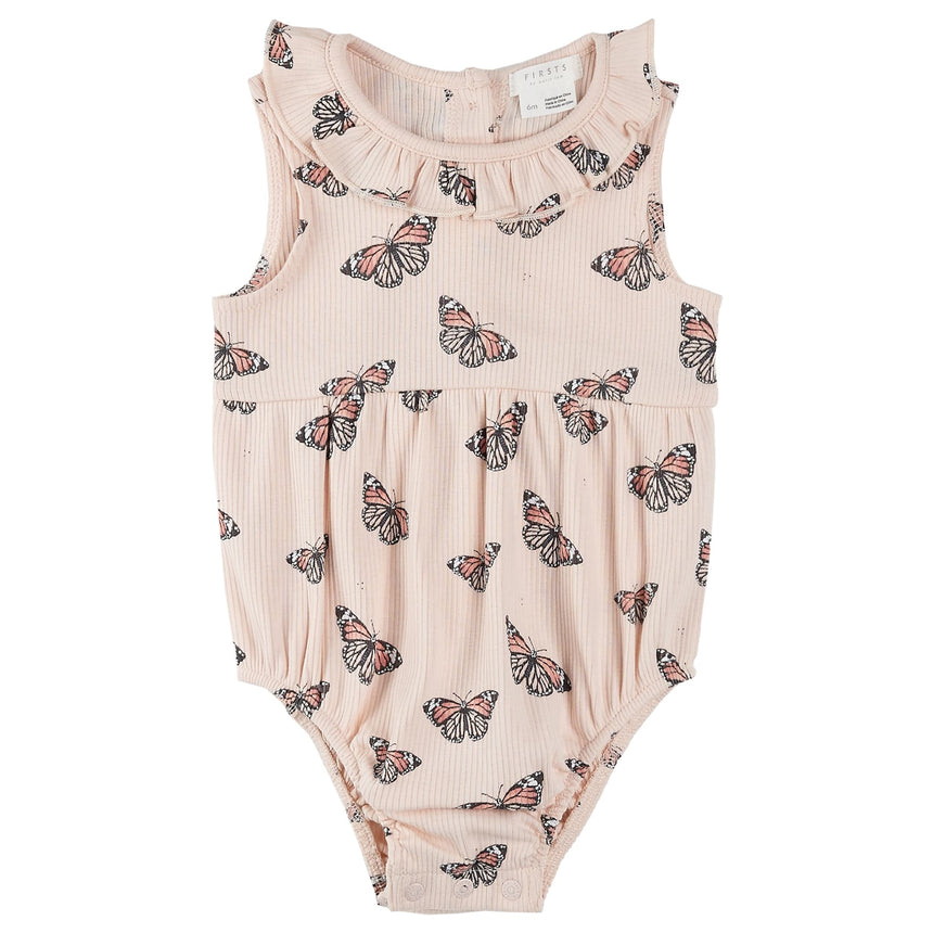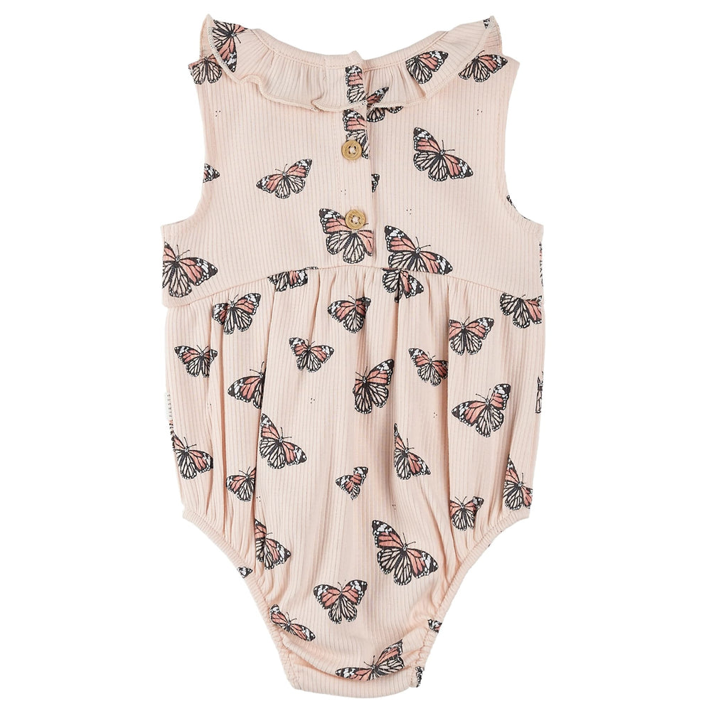 This pretty pink jumpsuit features elasticated legs to create a billowy fit that lets in the spring breeze, keeping your little one comfortable and cool all day long. With its adorable butterfly print and subtle ruffled collar, this jumpsuit will have her feeling as adorable as she looks. The buttons on the back allow the suit to be removed from the top or bottom and put on quickly and easily over the head.