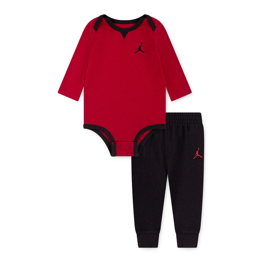Soft and breathable bodysuit with a crew neck, long sleeves, snap closure and contrast trim. Paired with french terry pants with an elastic waistband and ribbed cuffs. Finsihed with matching embroidered Jordan Jumpman logo on both pieces.
