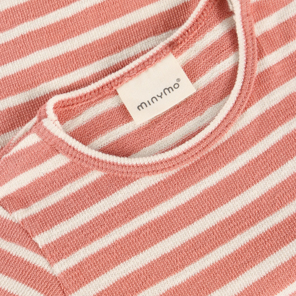 Suit from Minymo. The suit has short legs and sleeves. It features an elastic waistband and two visible front pockets. Additionally, the suit has a striped all-over print.