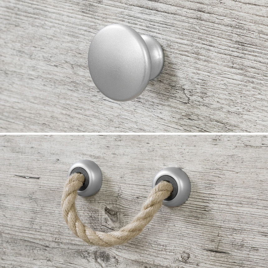 NAUTICAL CHARM: Featuring finish knobs and a rope drawer handles, this stylish double dresser will add a coastal charm to any room.