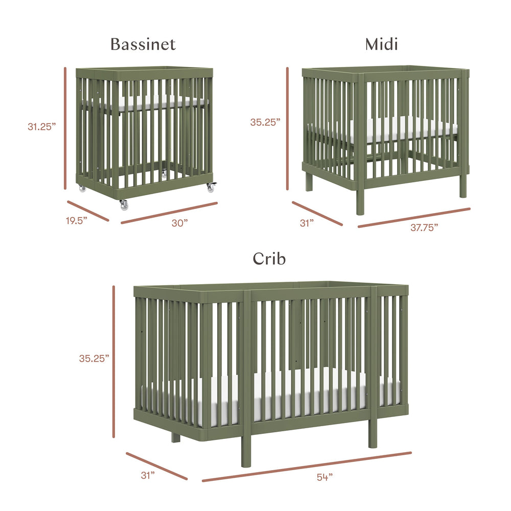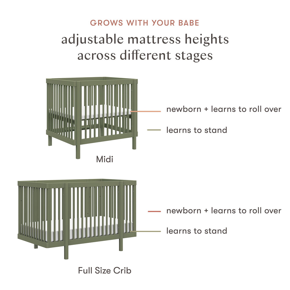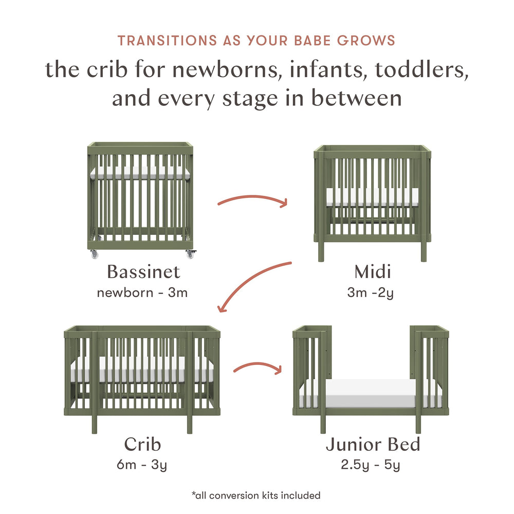 - ALL-STAGES® 8-in-1 convertibility with 8 conversions across 3 sizes: bassinet, midi crib, midi toddler bed, midi daybed, full-size crib, full toddler bed, full daybed, and junior bed.