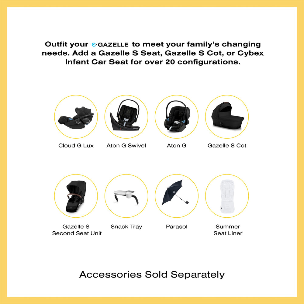 Accessories available for purchase: Gazelle S Second Seat, Gazelle S Cot, Any CYBEX Infant Car Seat, Snack Tray, Parasol, and Summer Seat Liner