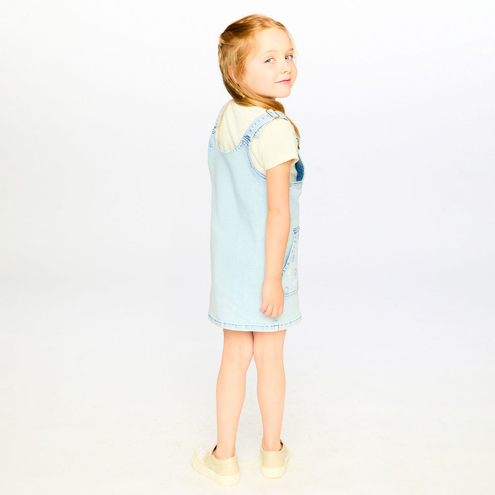 Casual yet chic, our light blue denim overall dress is a versatile piece for playful days. This sleeveless dress features adjustable buckle straps, front patch pockets with embroidered daisies, and a straight cut for effortless layering. Part of the “Explosion of Daisies” collection, it pairs beautifully with any tee or blouse from the line.