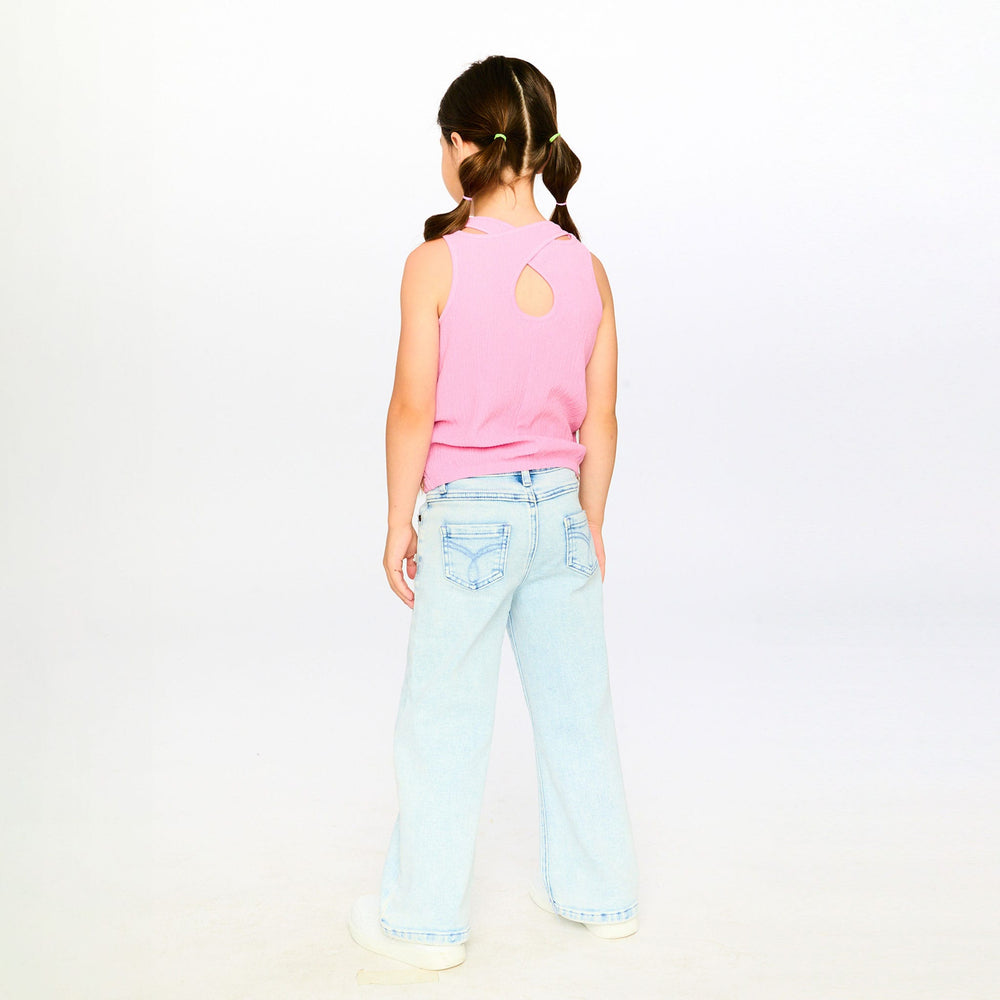 Playful and easy to wear, our crinkle jersey tank top in pink is perfect for warm days. This sleeveless camisole is crafted from soft crinkle jersey with a round neckline, a charming allover daisy print, elasticized hem for comfort, and cross straps at the back for a stylish finish. Pair it with shorts or a skirt from the “Explosion Of Daisies” collection for a breezy summer look.