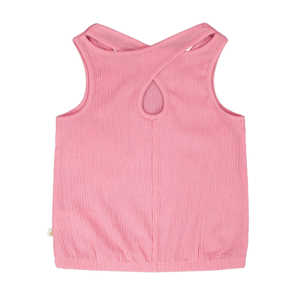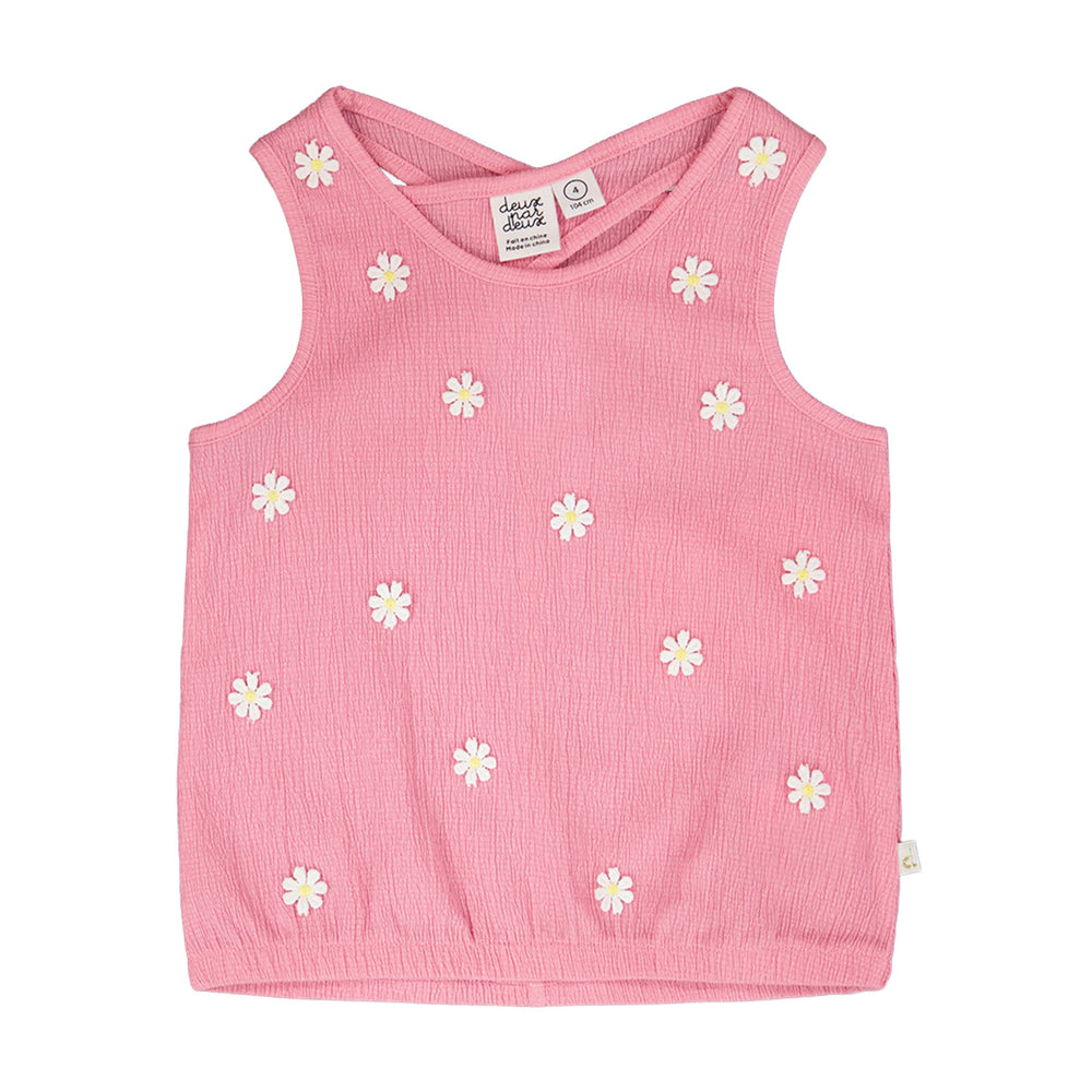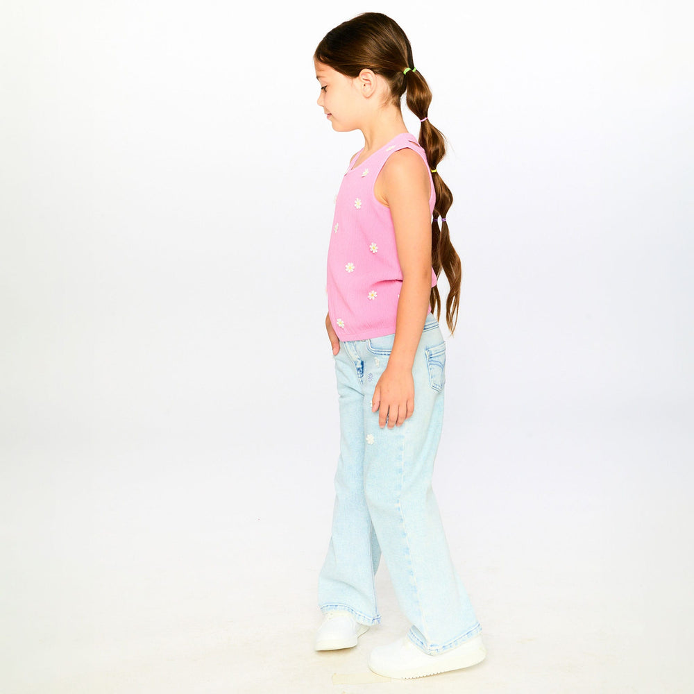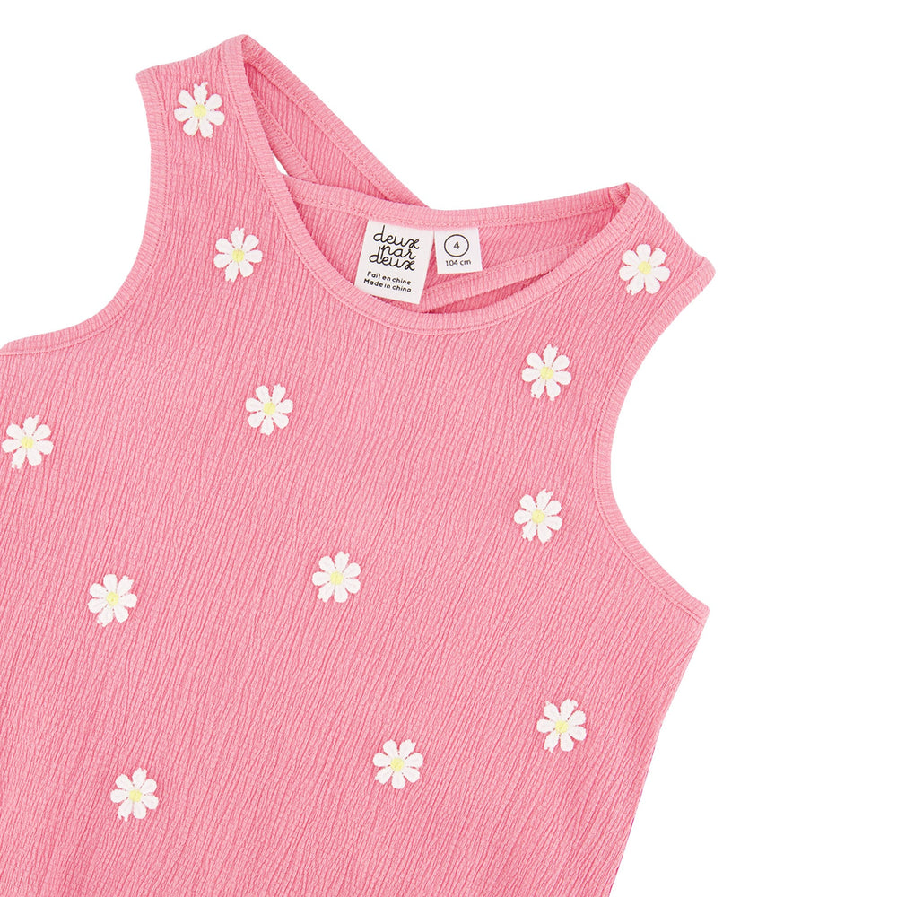 Playful and easy to wear, our crinkle jersey tank top in pink is perfect for warm days. This sleeveless camisole is crafted from soft crinkle jersey with a round neckline, a charming allover daisy print, elasticized hem for comfort, and cross straps at the back for a stylish finish. Pair it with shorts or a skirt from the “Explosion Of Daisies” collection for a breezy summer look.