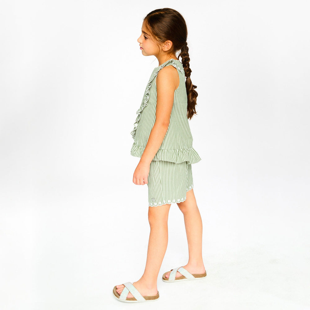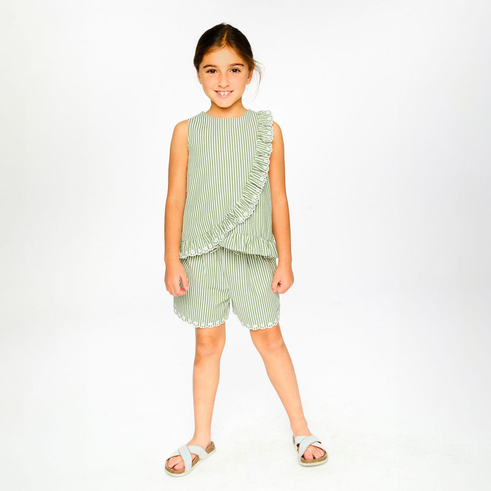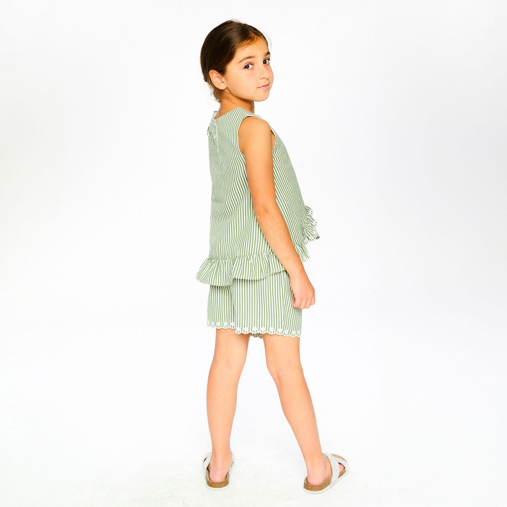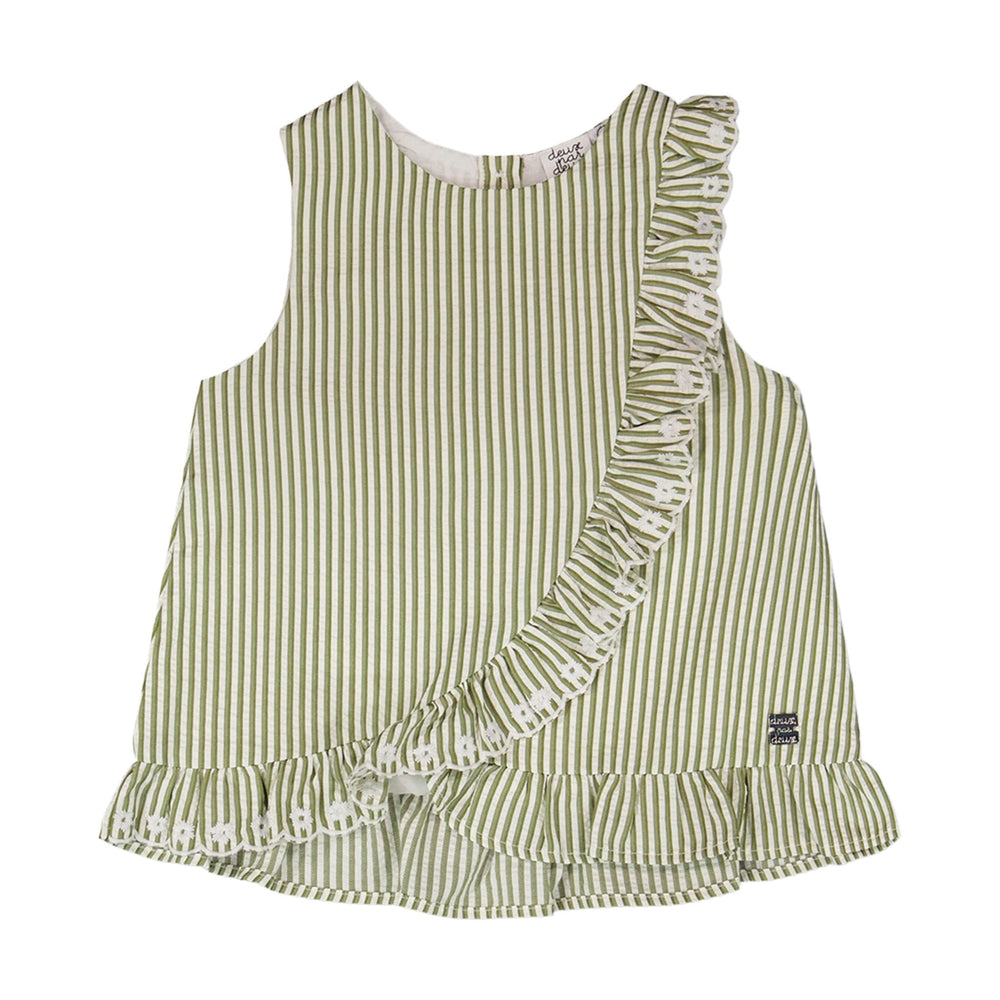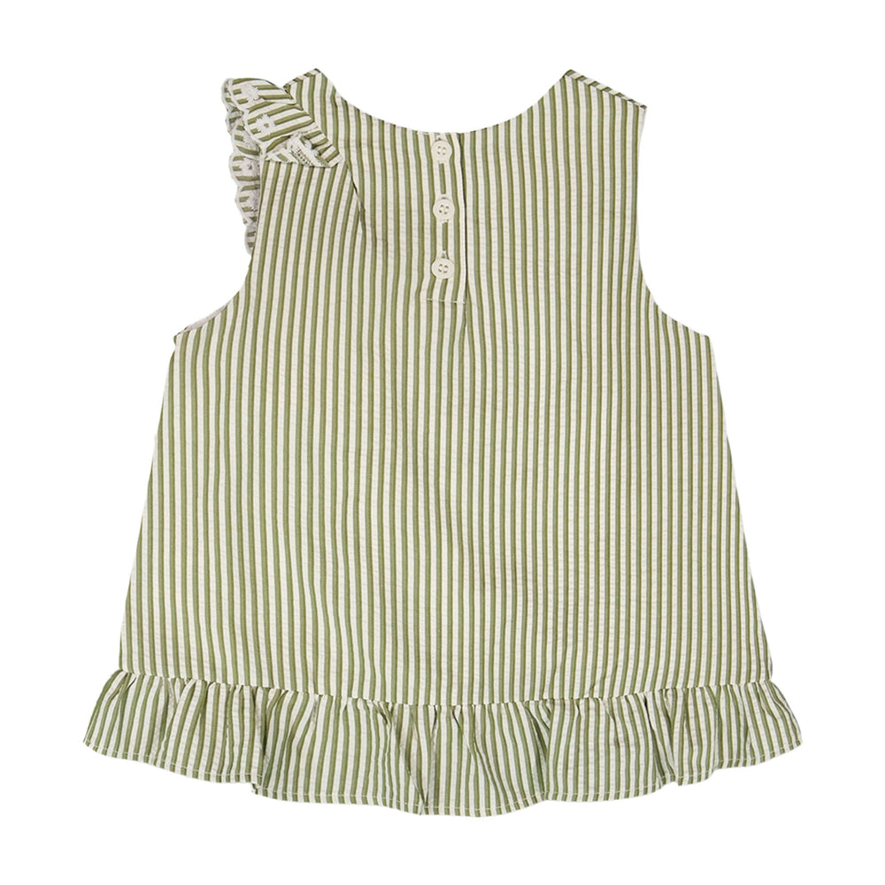 The top in green and off white stripes with embroidered ruffle brings a delicate, feminine touch to summer looks. This sleeveless blouse features a round neckline, vertical stripes, a back button closure, and an asymmetrical ruffle adorned with floral embroidery that cascades across the front. Made from a soft polyester-cotton blend, it’s perfect for pairing with skirts or shorts from our “Under My Straw Hat” collection.