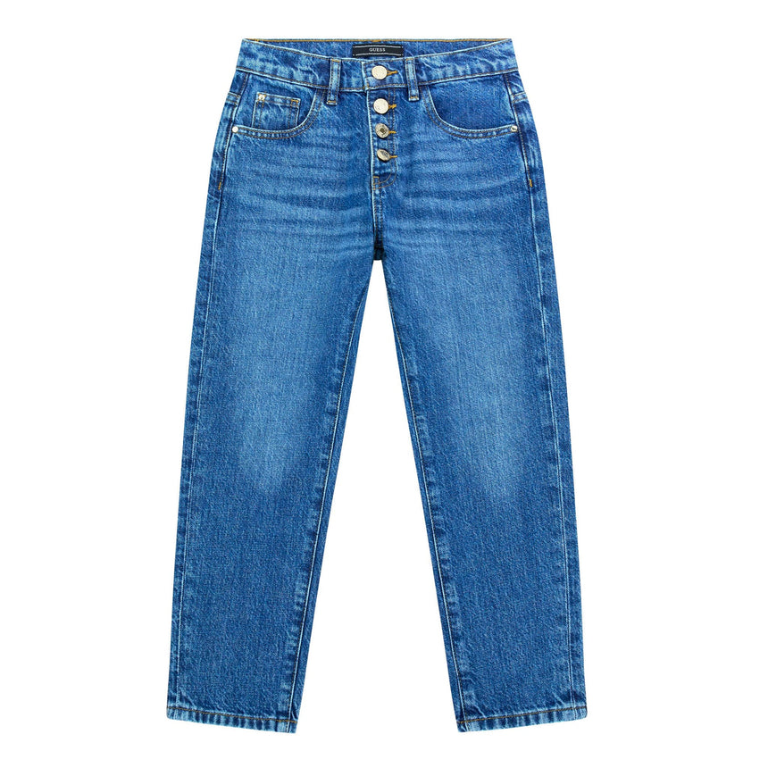 Features: Putting out a vintage 90's vibe in these GUESS rigid denim Mom jeans. Classic GUESS 5 pocket construction with button up closure. Feature a rose gold tone script rhinestone logo on the back pocket and a wash treatment that makes each pair unique.