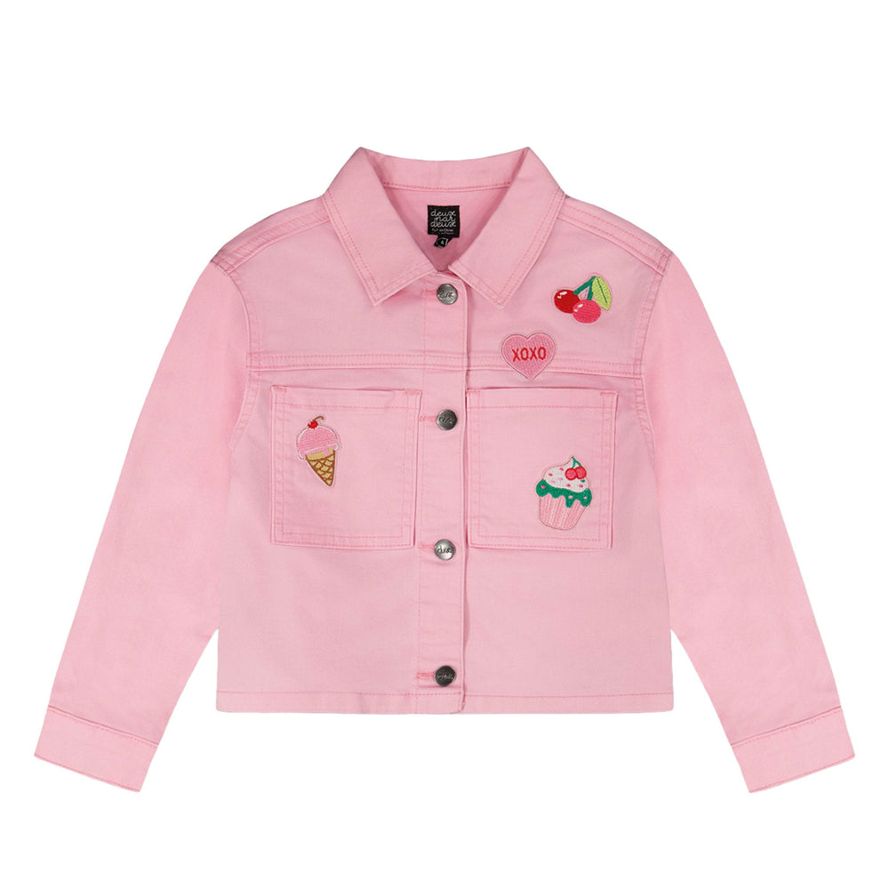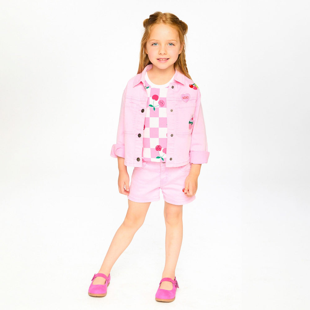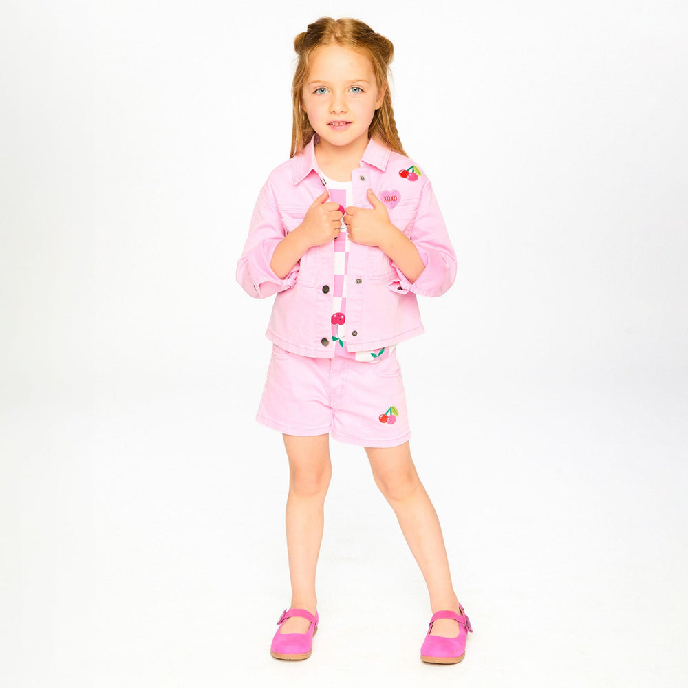 This pink denim jacket with embroidered patches is a fun twist on a timeless wardrobe staple. This jacket is detailed with playful cupcakes, ice cream, and cherries patches, front patch pockets, and front buttons for easy layering. Made in soft cotton denim with a hint of stretch, it brings comfort and durability to everyday adventures in our “Cherry On The Check” collection.