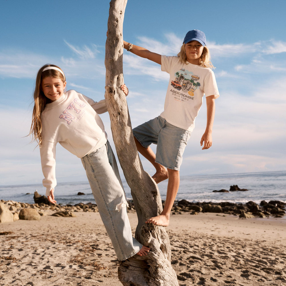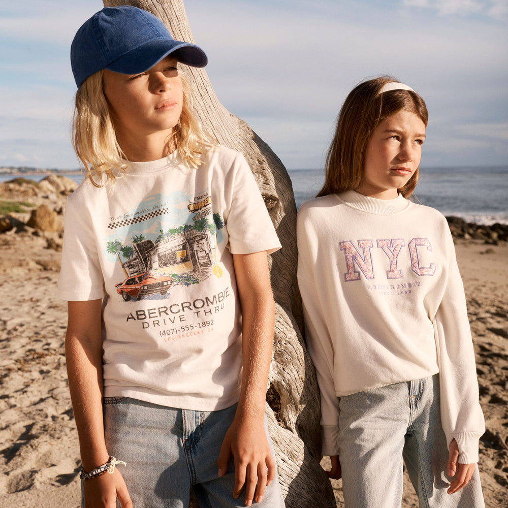 This sweatshirt from abercrombie kids is a wardrobe essential made of cotton/poly fleece in a cropped, roomy silhouette and features a filled NYC graphic. The tagless crewneck creates comfy, fuss-free wear, dropped shoulders provide a relaxed fit, and the sleeves have thumbhole cuffs that add a sporty touch.
