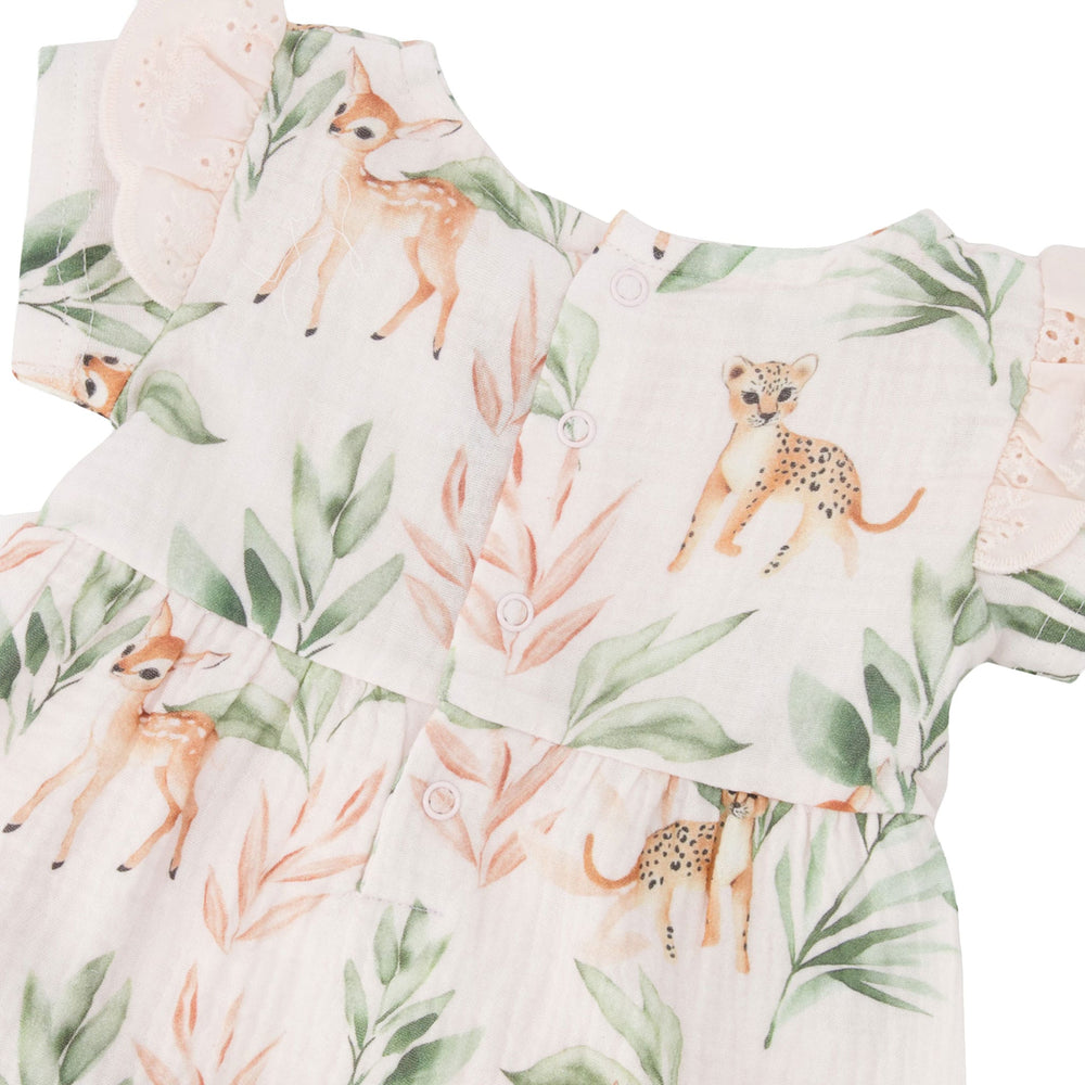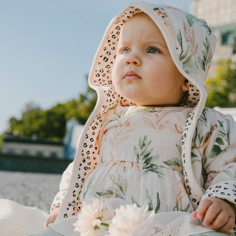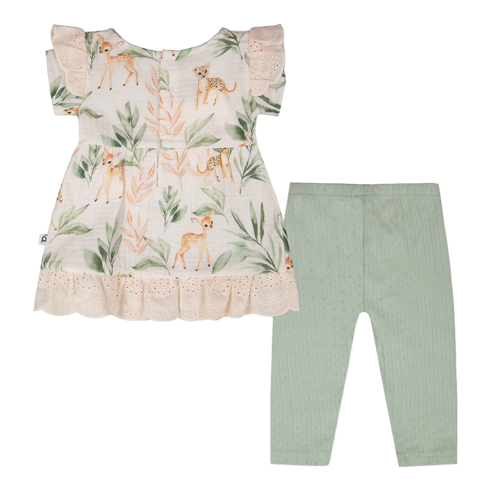 The muslin tunic and pointelle leggings set peach with deer print and green brings a breath of springtime charm. A delicate tunic with short sleeves with ruffles, a gathered waist, and a frilled hem pairs with textured pointelle leggings in soft green. The tunic is made from lightweight muslin enriched with elastane for comfort, while the leggings are crafted from pure cotton for breathability. Perfect for playful outings or sunny strolls, this set captures a poetic blend of style and comfort. Ideal for pairing with other pieces from our "Savannah Whispers" collection for a harmonious seasonal look.