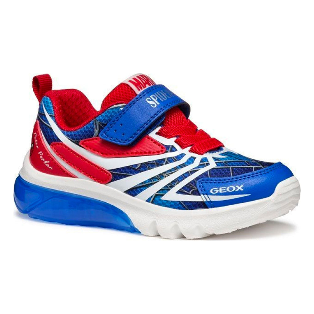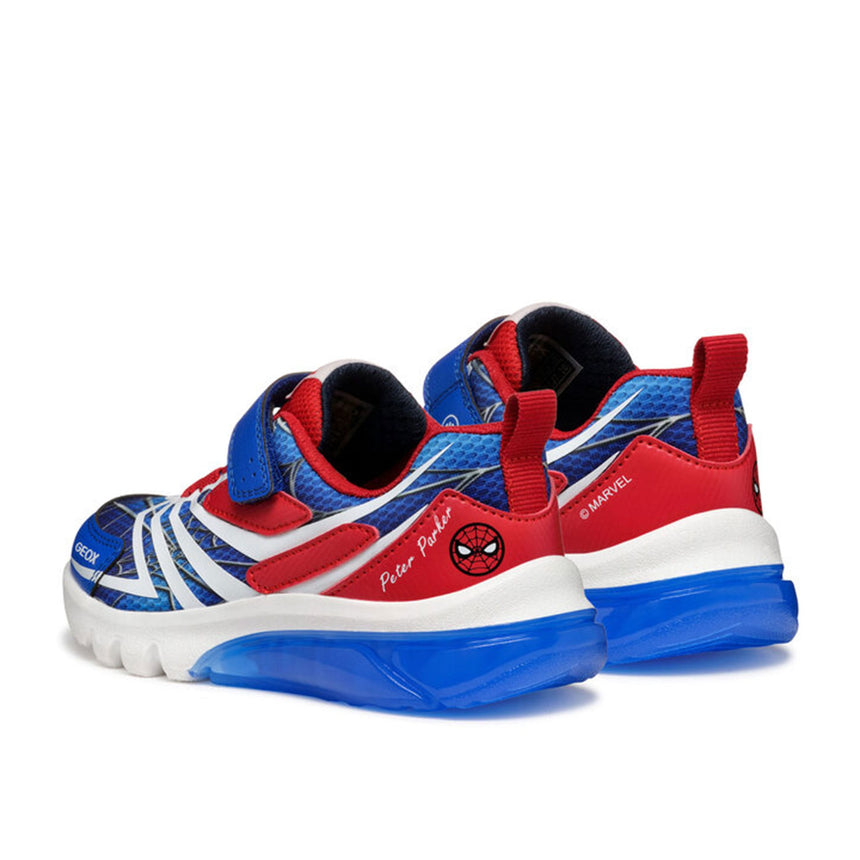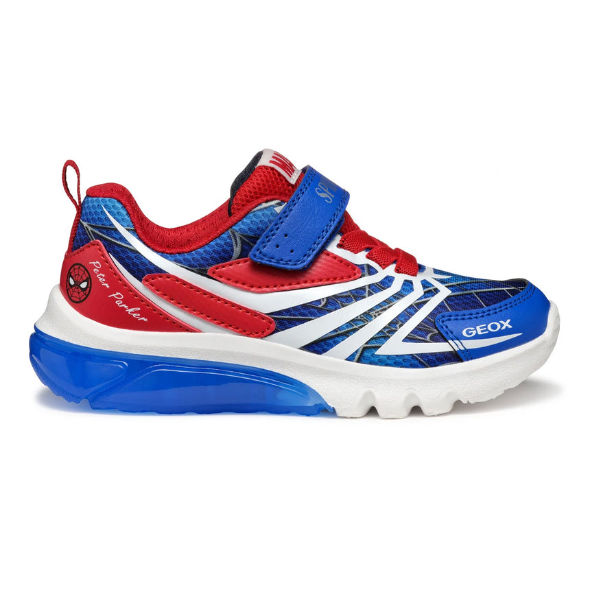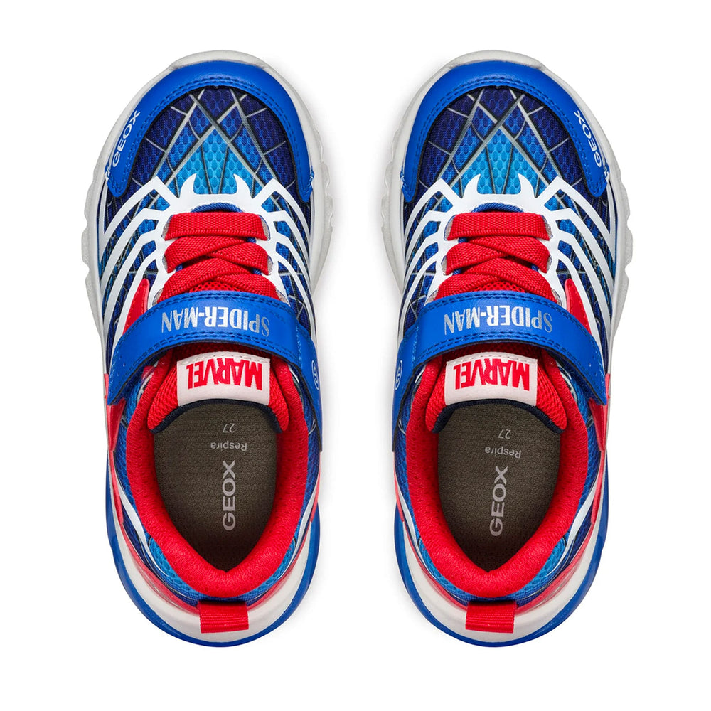Cushioned and breathable boys’ sneakers with a sporty and dynamic vibe, featuring lights built into the outsole. This royal-blue and red version of Ciberdron boasts an upper embellished with printed details and 3D embellishments that draw inspiration from Spider-Man. A product of the partnership between Geox and Marvel, it is crafted from mesh and a printed leather-effect material, and is the perfect companion for school days and playtime alike.