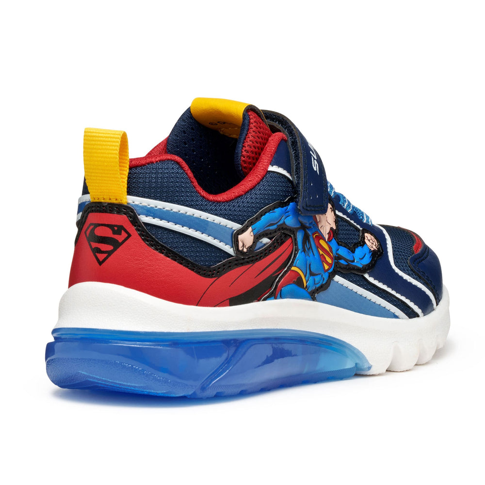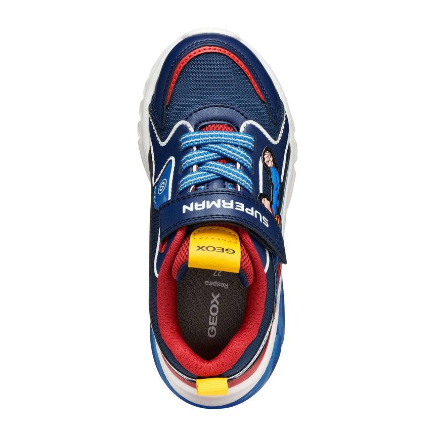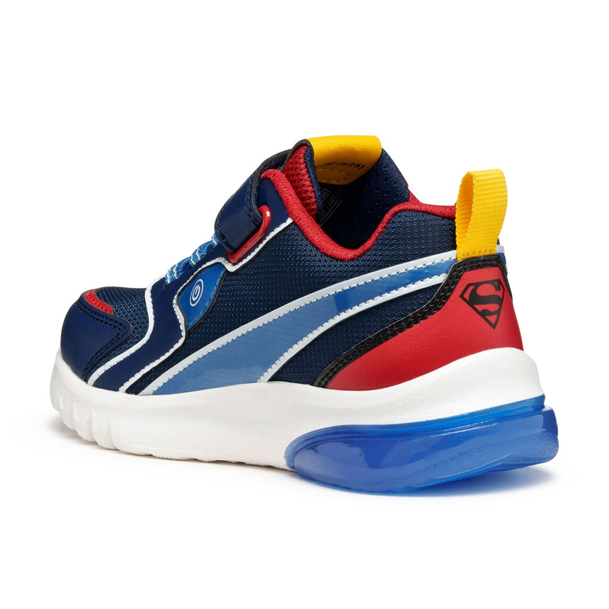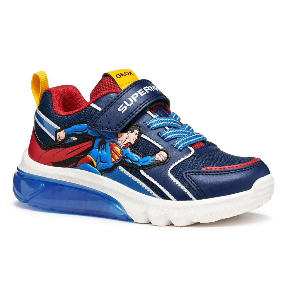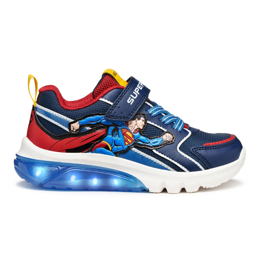 Sneaker with an active modern design which takes its cues from the heroic Superman and was devised under the partnership between Geox and the Warner Bros. It boasts an upper made of a leather-effect material and fabric in a blue and red colourway and includes details which evoke the iconic cartoon character. Ciberdron has been fitted with lights in the sole that will brighten sporty schoolday outfits and leisuretime looks with a fun feel.