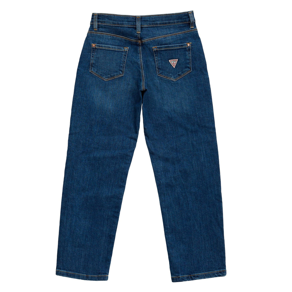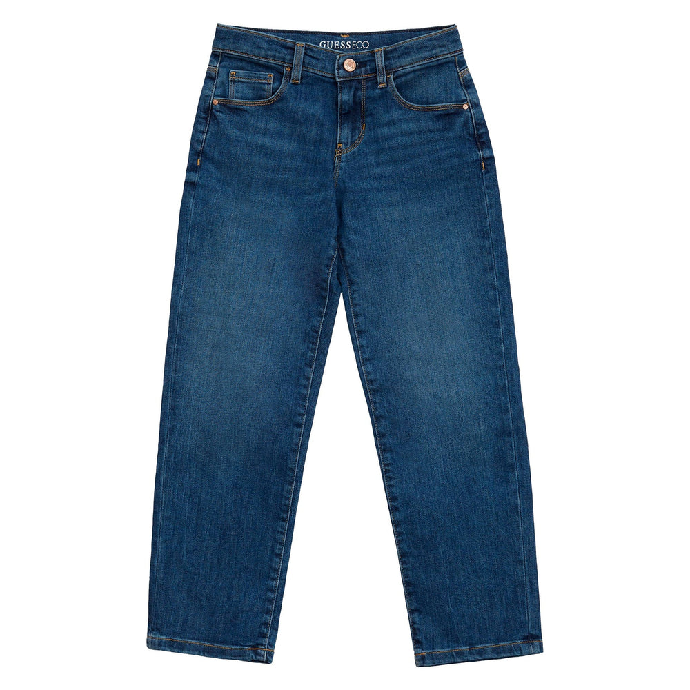 FEatures: Woven denim , Mid-rise fit, Zip fly and button closure, Straight leg, Five pocket construction, Interior adjustable waistband (up to Size 12) , Cotton/recycled cotton fiber, Triangle patch on back pocket