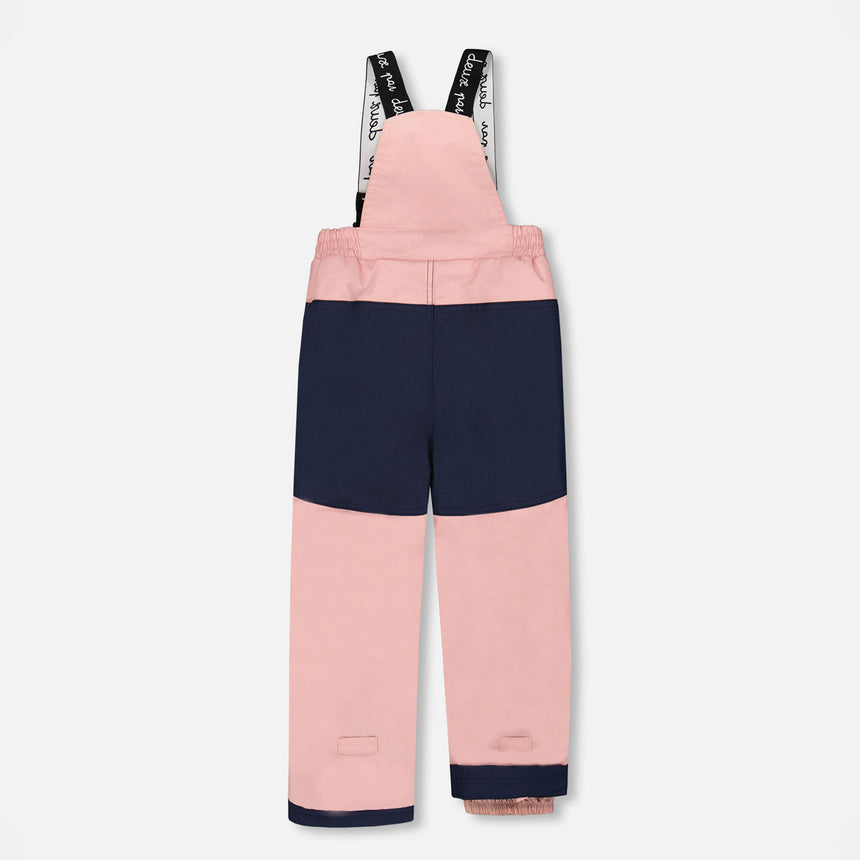 -Pants with elastic waist and adjustable suspenders. Ankles equipped with snow guards and rubberized elastic band.