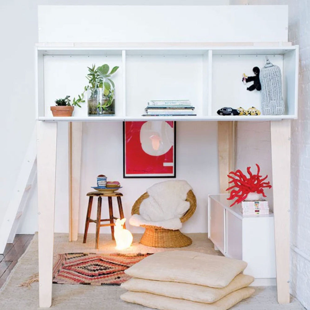 Compact footprint makes loft bed great for small spaces Brooklyn Desk, Mini Library, Toy Store fit perfectly underneath the Perch Loft Bed