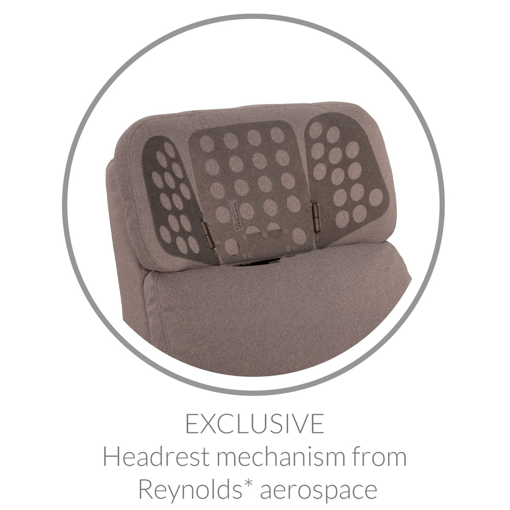The new Hailey recliner with an adjustable winged headrest offers a unique enveloping design that provides a sense of security and optimal comfort, perfect for long nights or moments of relaxation. This headrest, inspired by the aeronautical industry, is designed to offer personalized comfort with its adjustable height, adapting to the specific needs of each parent. Its foldable or collapsible side wings provide additional support by keeping the head in a stable and ergonomic position, preventing it from tilting to the sides—particularly useful during sleep or prolonged rest periods.