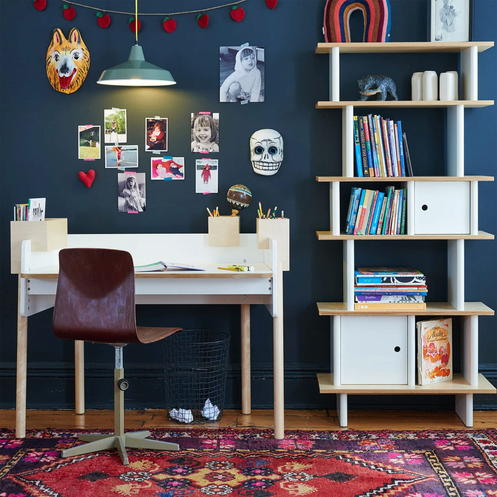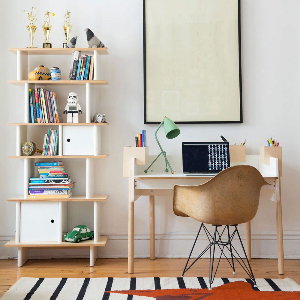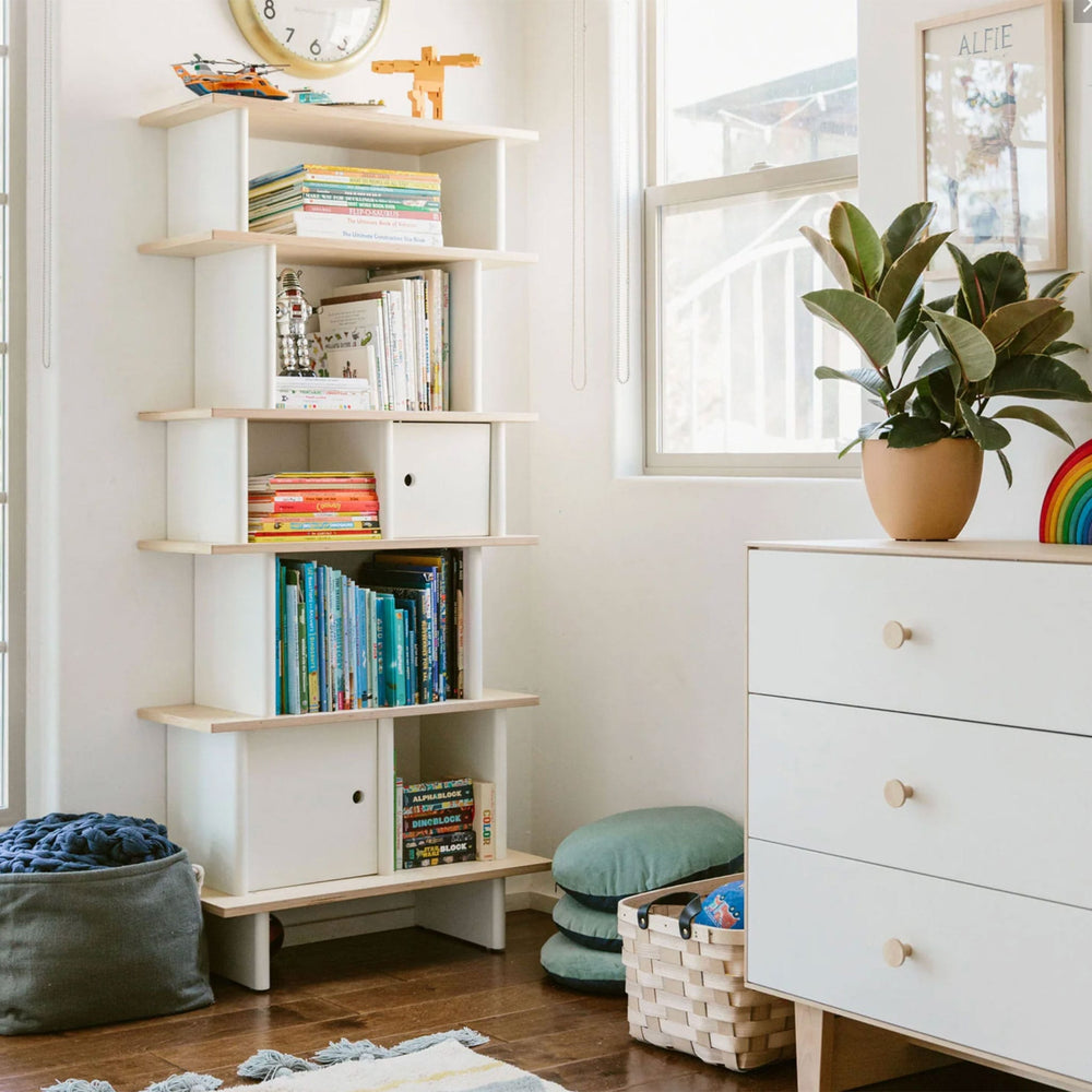This bookcase was inspired by the original Mini Library. Its tall, compact design makes it a perfect fit for any size room. Shelves and stylish cubbies provide ample space for books, toys, and other treasured items.