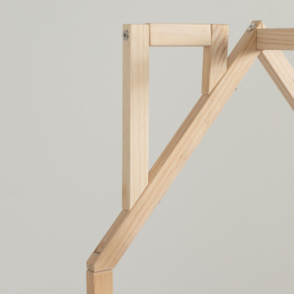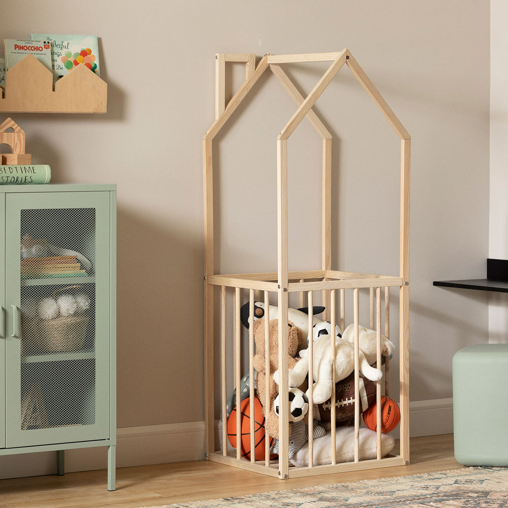 A playroom decor is often colorful, cheerful, and fun. That's exactly what we had in mind when we designed this storage unit. We love its small house shape, its triangular roof, and its little chimney. Its Scandinavian style and straight lines also contribute to its cute look and will bring a more calm and soft touch to your room. Since this structure is made of natural wood, it also has an authentic charm.