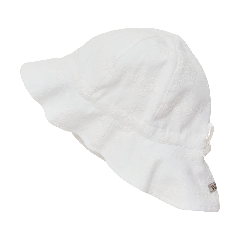Cute sun hat wih embroidery from HUTTEliHUT. The hat is made of 100% cotton with a solid cotton lining. A cord runs through the middle of the hat, forming a bow at the back and allowing for adjustment to the child's individual head shape. Extra length at the back. Perfect for providing some shade on a warm summer day. Certified acc. to OEKO-TEX® STANDARD 100 Cert. No. 2276-364 DTI