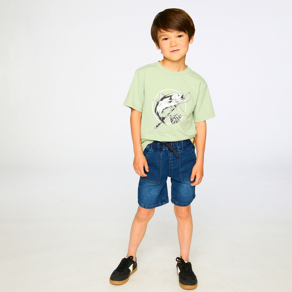 The French terry navy blue denim shorts are a summer essential with a comfy twist. This pair features deep front slant pockets reinforced with topstitching, perfect for keeping treasures safely tucked in, along with an elastic waistband, drawstring, and belt loops for a secure fit. Made from soft stretch denim with a terry texture inside, it combines the look of jeans with the comfort of loungewear—perfect for boys and baby boys on the move.