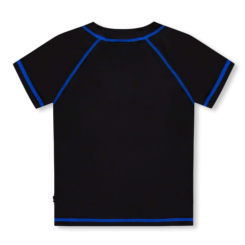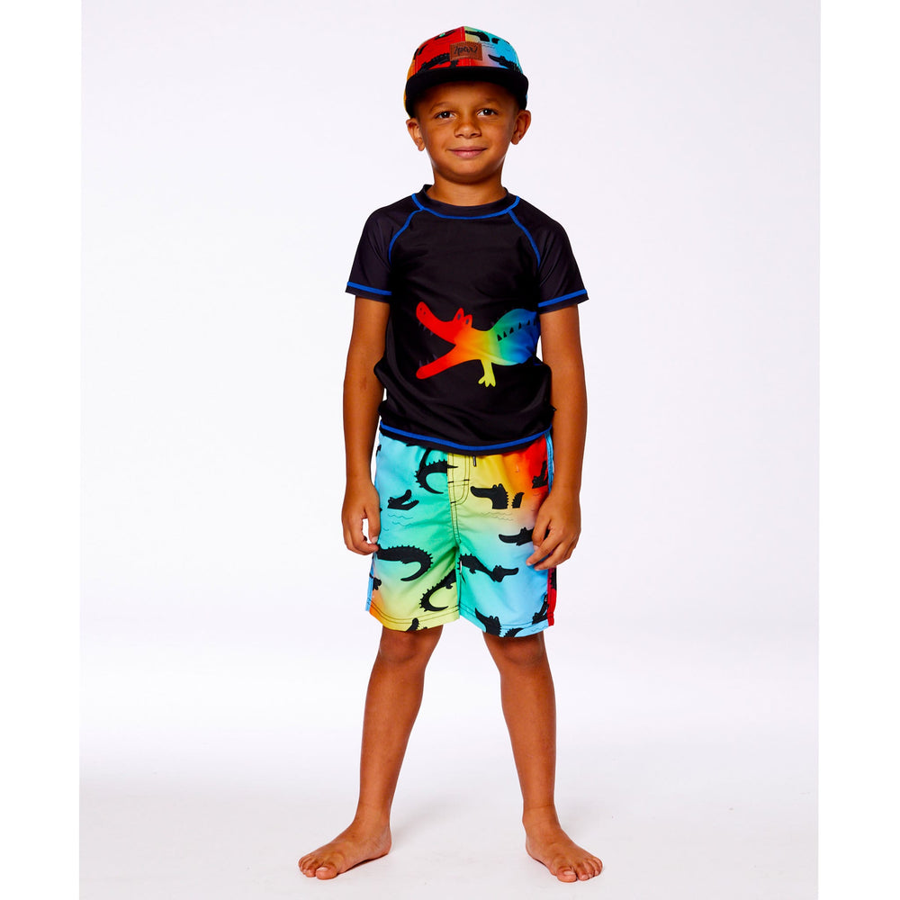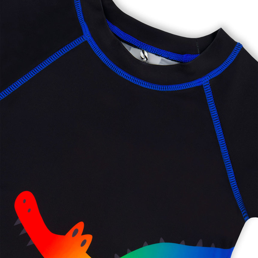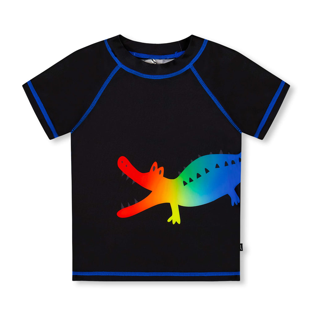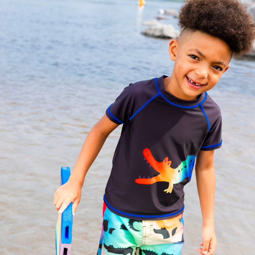 A gradient print adds bold, bright style to our navy, turquoise and orange short-sleeved rashguard. Offering UPF 50+ sun protection, this colorful rashguard has short raglan sleeves, a crew neck, a sloth print to the chest and contrast stitching to the collar, sleeves and hem.
