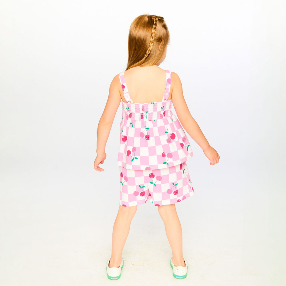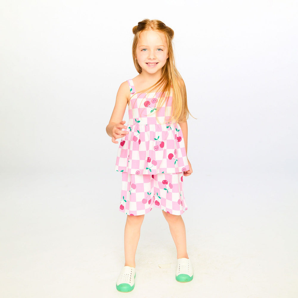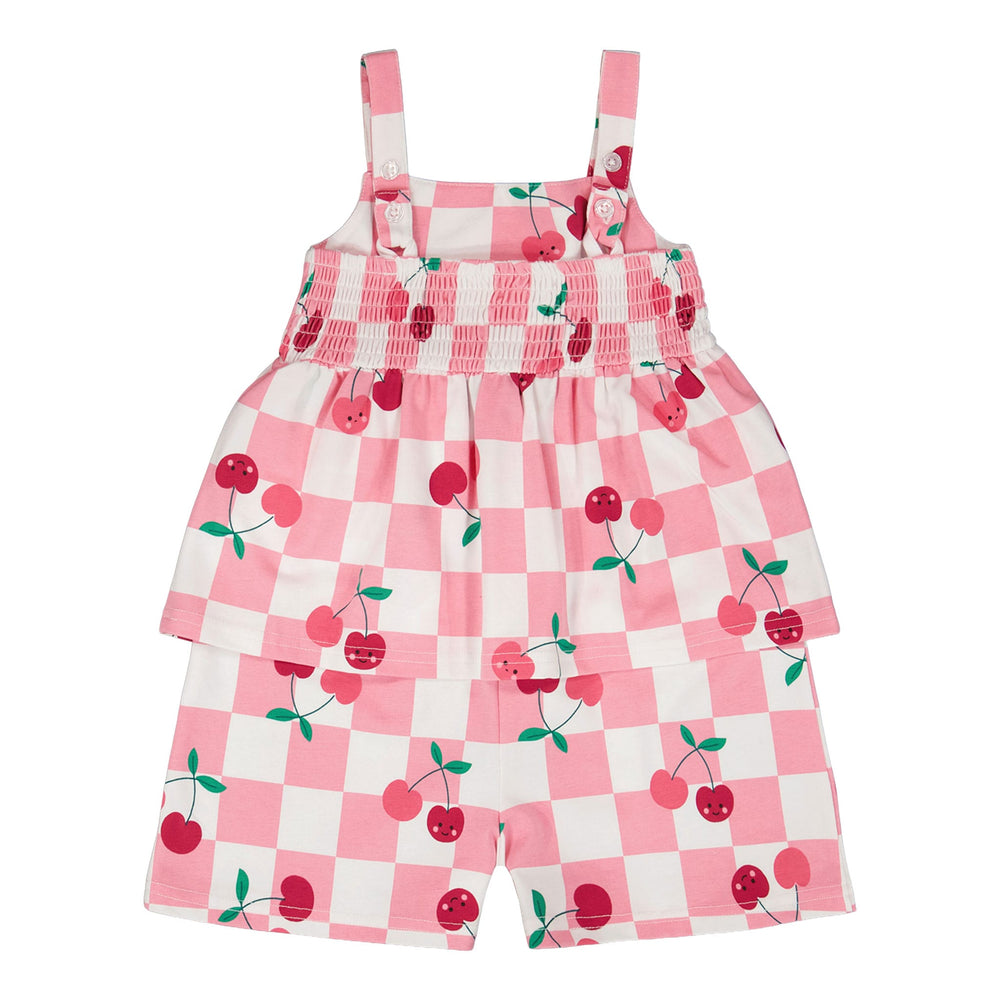This organic cotton jersey romper in pink with printed cherries is a sweet and playful choice for sunny days. This one-piece features a pink and white check pattern adorned with allover cherries, with slender straps and a flounce overlay for extra charm. Made with soft organic cotton and a hint of stretch, it combines breathable comfort and cheerful style in our “Cherry On The Check” collection.