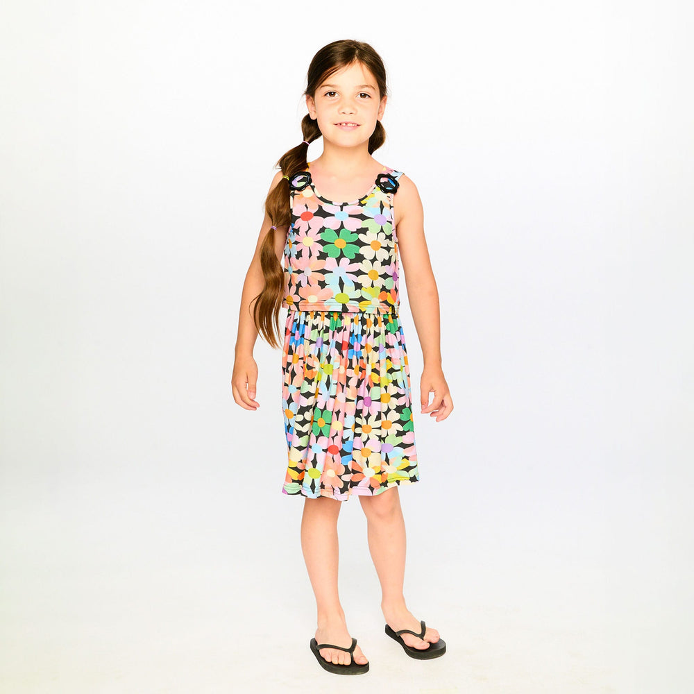 This dress bursts with charm thanks to its all-over colorful flower design on a black background. This sleeveless dress features playful shoulder straps with flower-shaped buckles and a softly gathered flowy skirt for a twirl-ready look. Made from breathable viscose with a soft polyester lining, it offers both comfort and style for sunny outings.