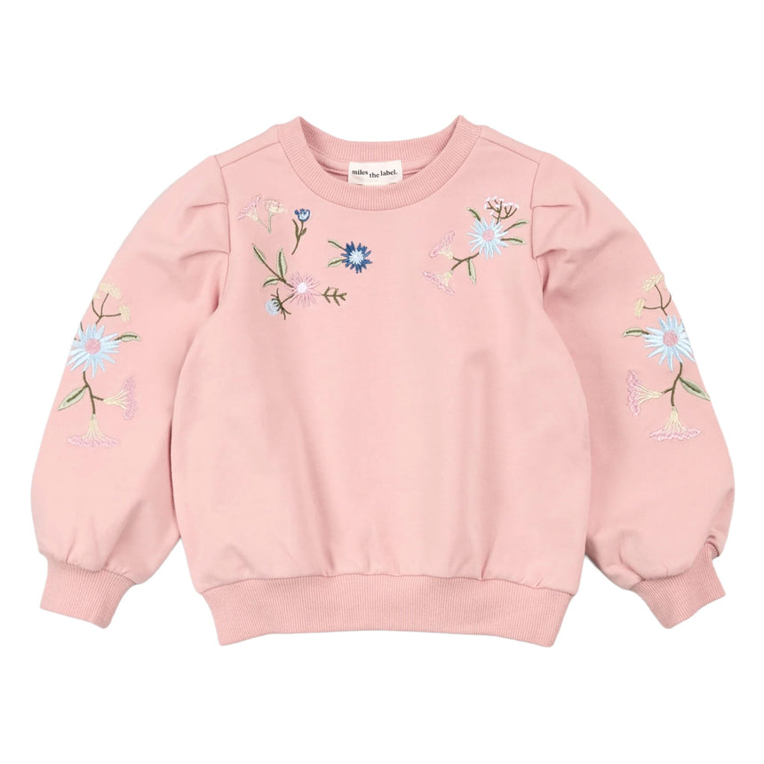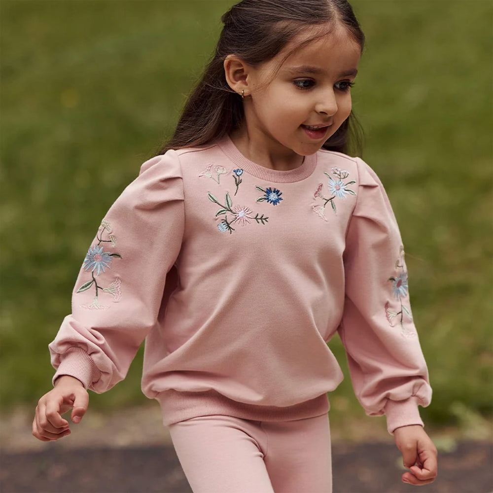 This cozy sweatshirt features delicate floral embroidery—an ideal mid-season piece. Made from organic cotton, it’s lightweight and breathable while providing a touch of warmth on cooler days. The crew neck and ribbed cuffs make dressing easy, and a matching legging is available to simplify outfit choices on busy mornings.