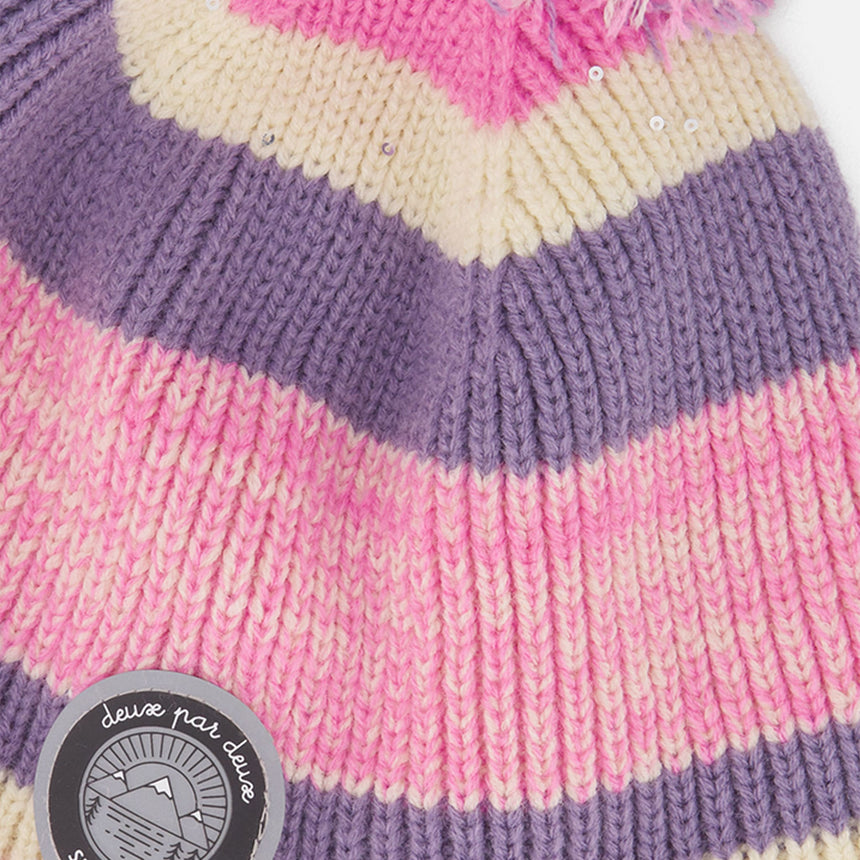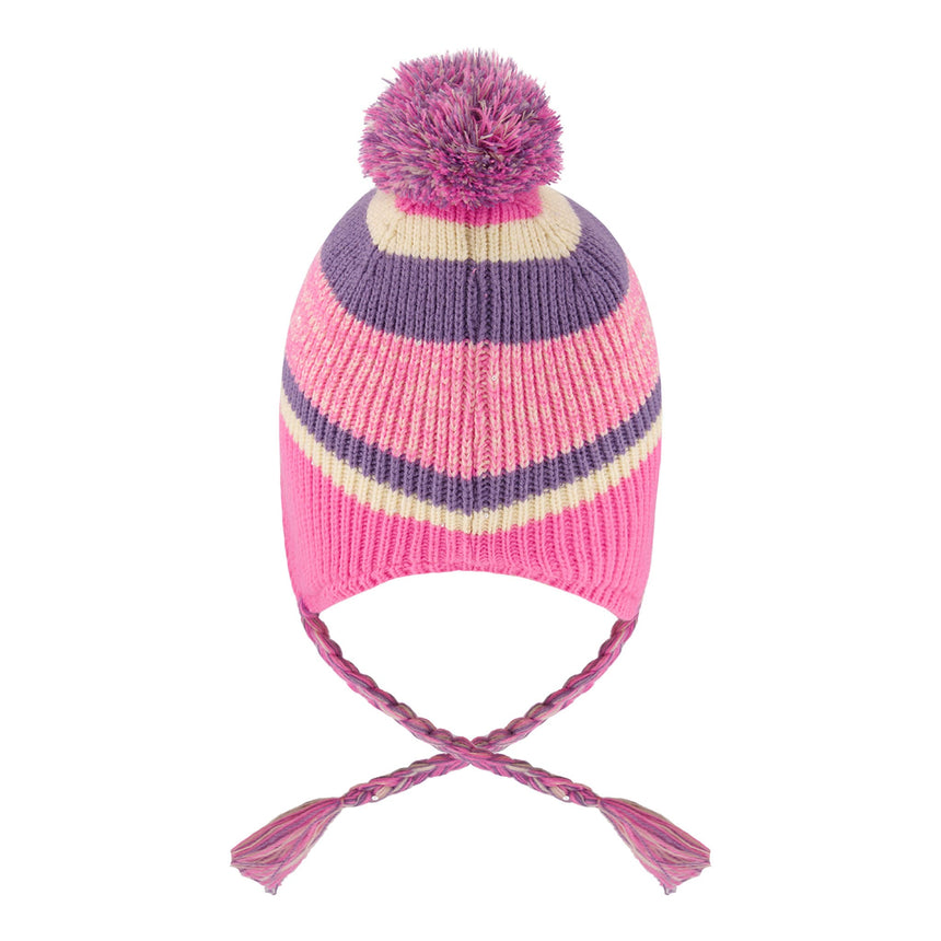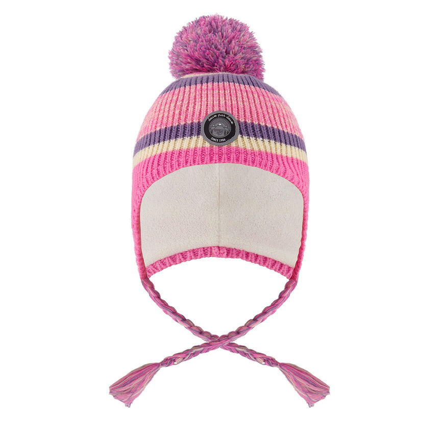 Soft and stretchy with a polar fleece lining for extra warmth, this knit cap offers an added layer of protection in ultra-cold temps. With variegated horizontal stripes and a colorful pompom on top, this Peruvian hat covers the ears completely to shield little lobes from the cold and snow.