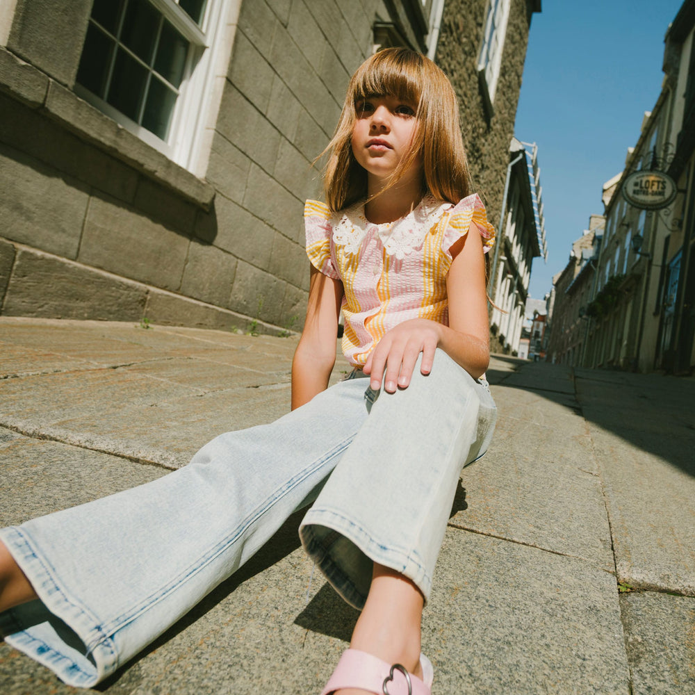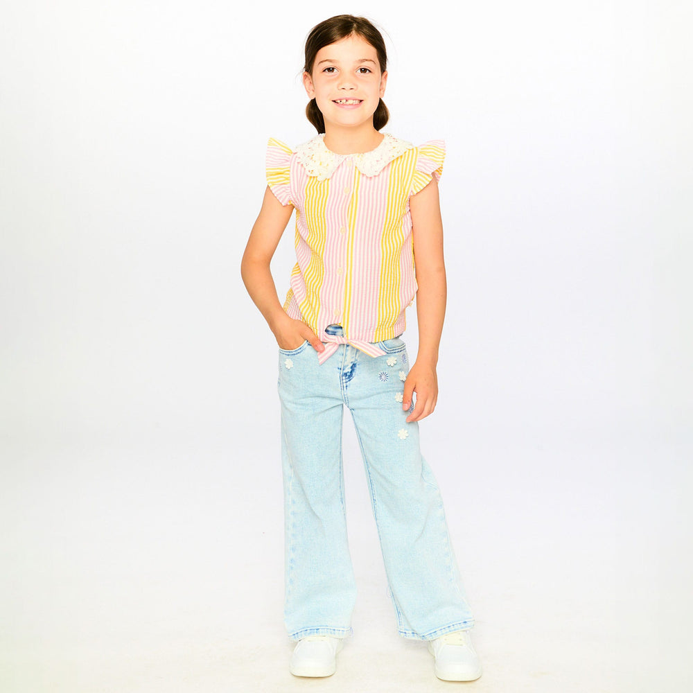 Fresh and stylish, our sleeveless shirt with pink and yellow stripes and a crochet collar is perfect for sunny days. This blouse features flutter details at the shoulders, a delicate crochet Peter Pan collar, a full front button placket, and a charming front tie knot for a playful twist. Part of the “Explosion of Daisies” collection, it pairs beautifully with skirts, shorts, or pants for an effortlessly chic summer look.