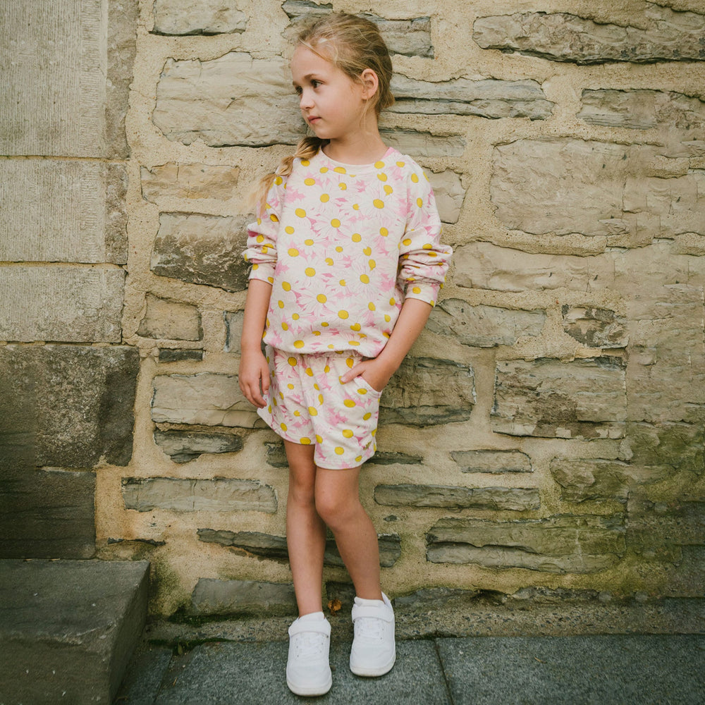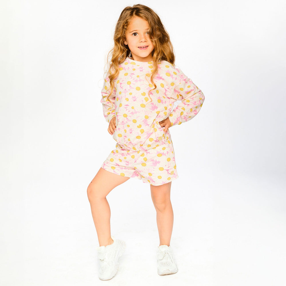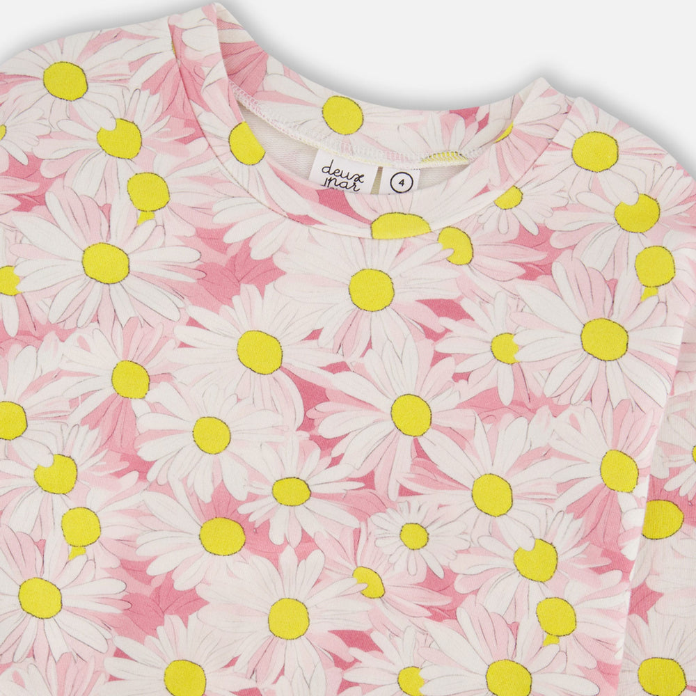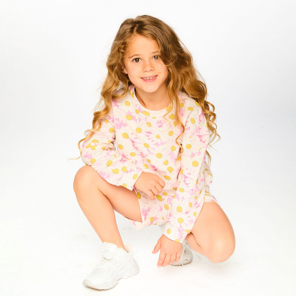 Playful and cozy, our French terry sweatshirt pink with printed daisies is the perfect piece for everyday adventures. This sweater features an allover daisy print, a round neckline, and an elasticized bottom hem that gives it a snug yet comfortable fit. As part of the “Explosion of Daisies” collection, it adds a cheerful floral vibe to any outfit.