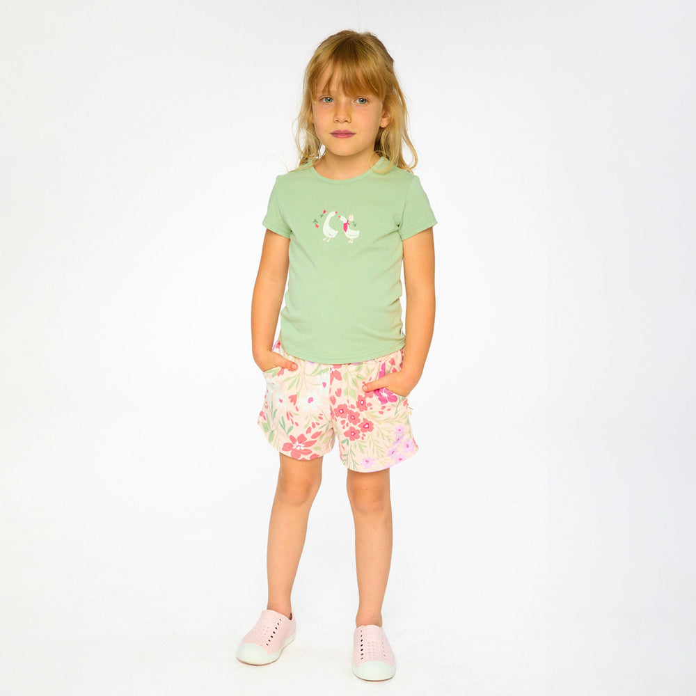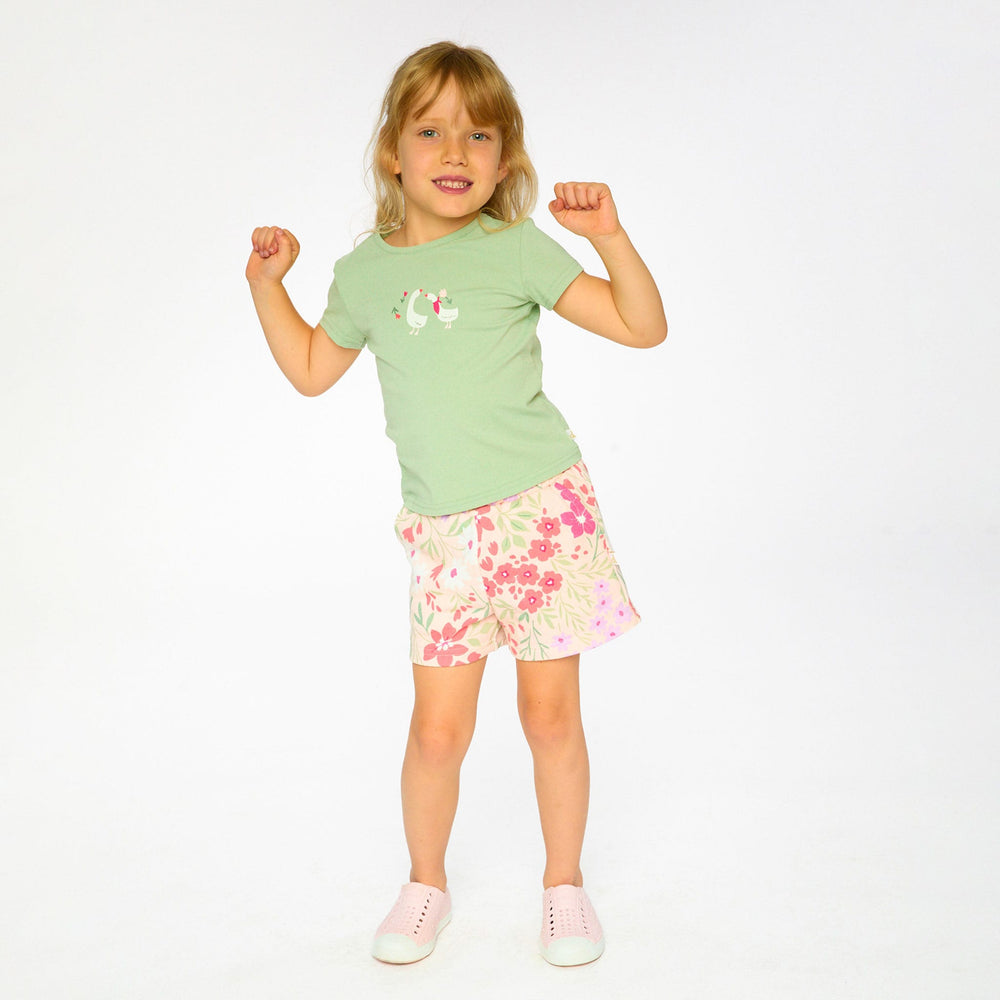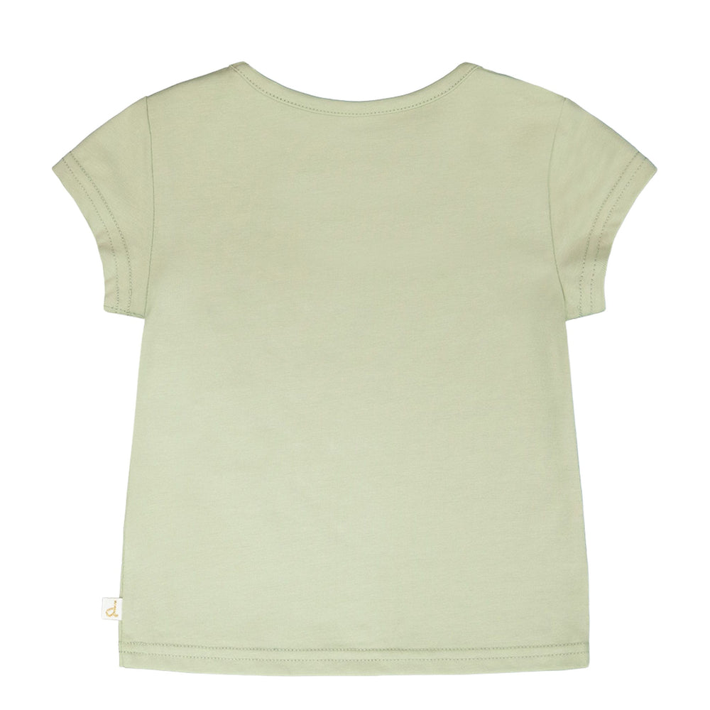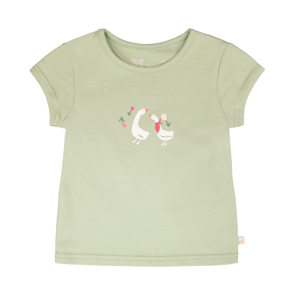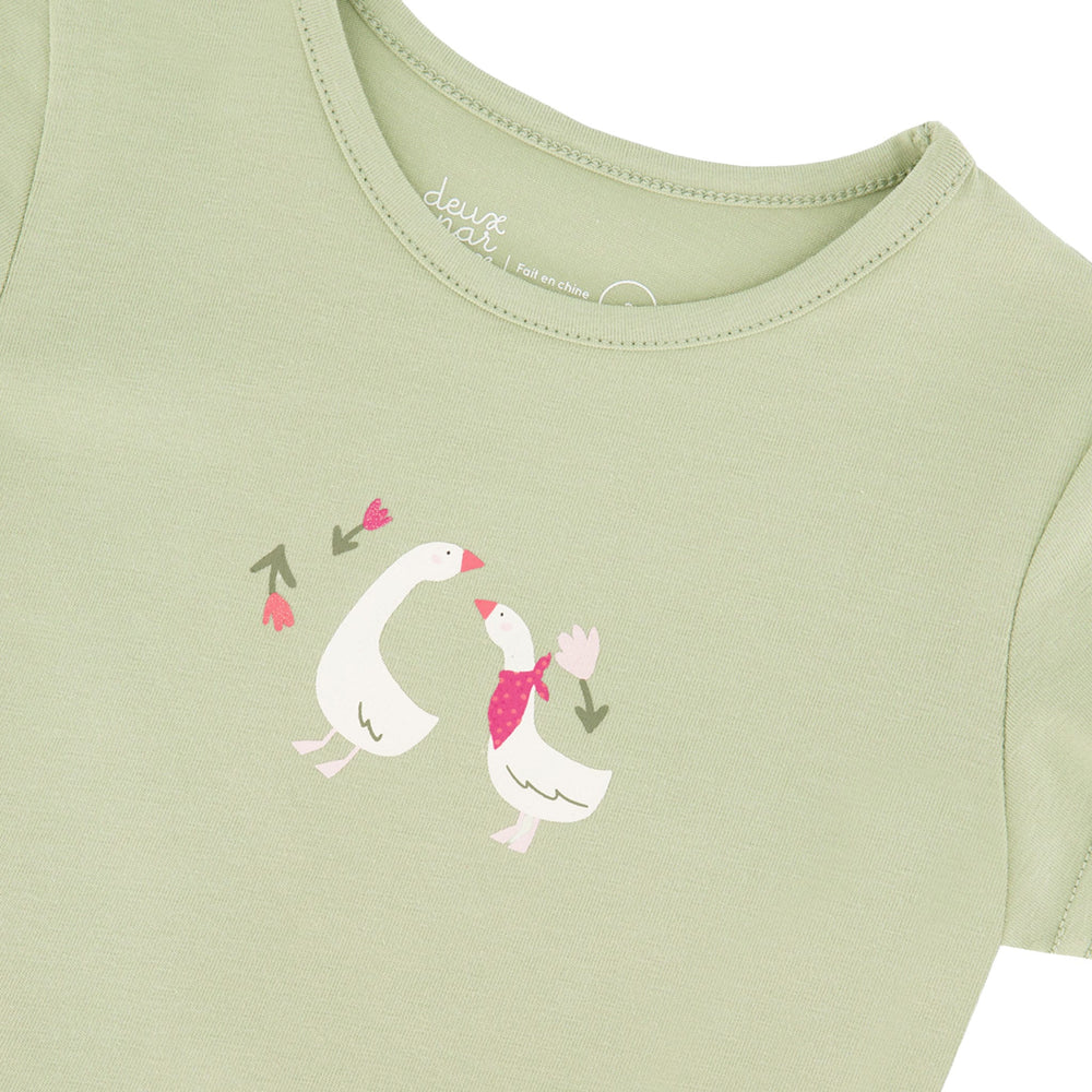 Our organic cotton jersey t-shirt in light khaki green is a sweet everyday essential with a playful twist. This top features short sleeves, a round neckline, and a front graphic of two little geese for extra charm. Soft and stretchy, it’s ideal for girls and baby girls, easy to coordinate with bottoms from our "Little Meadow" collection.
