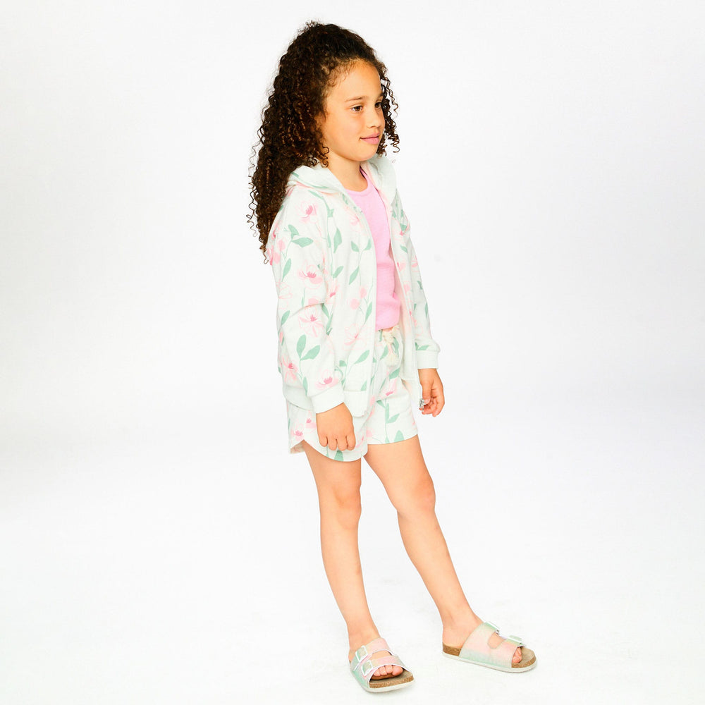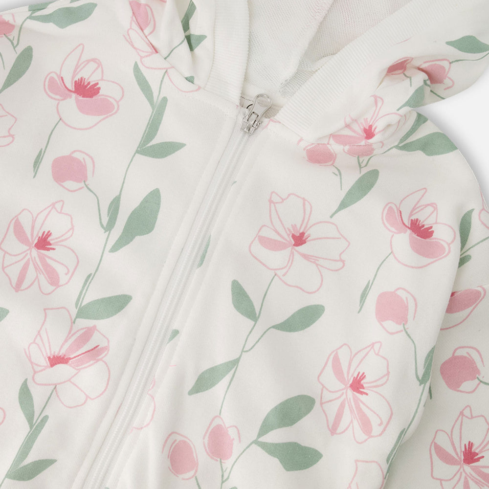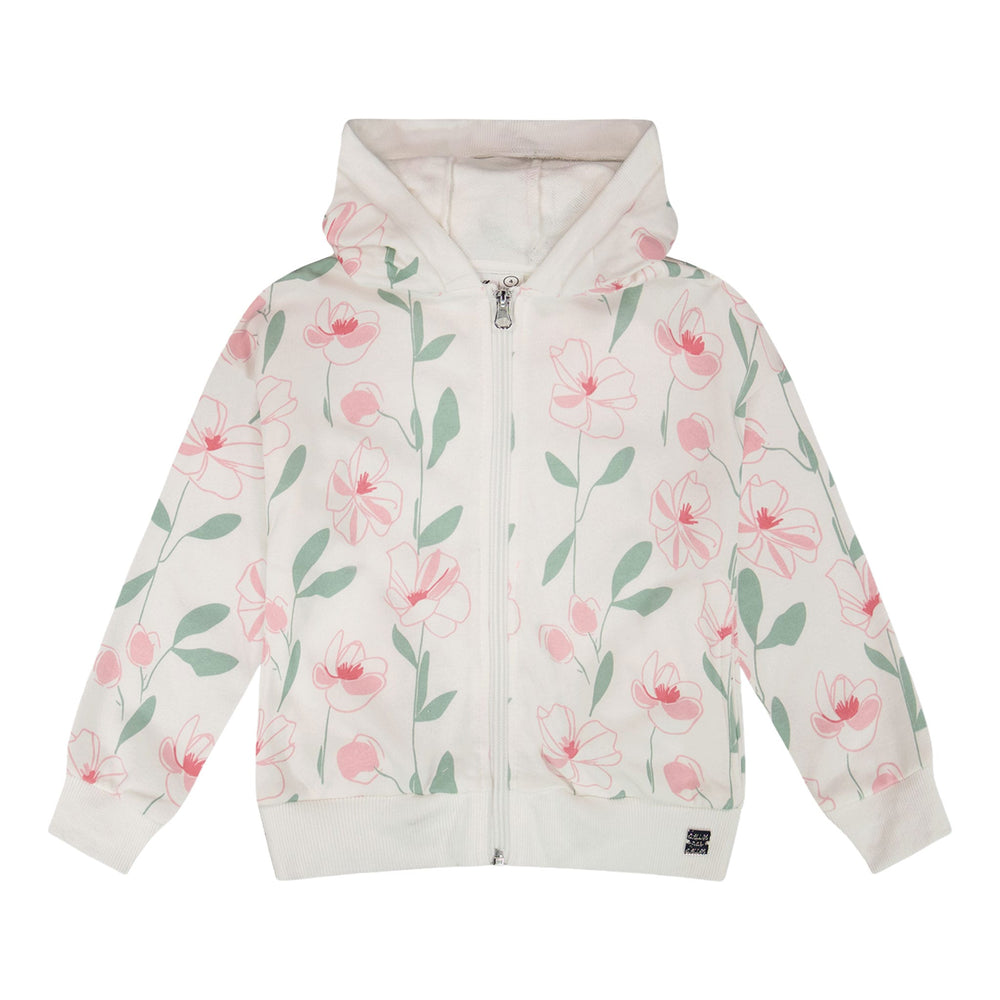 The French terry hoodie in off white with printed flowers is a cozy yet stylish layer for spring days. This sweatshirt features a practical full zip front, an attached hood, and ribbed trims that ensure comfort and flexibility. Made from soft cotton French terry with a hint of stretch, it is perfect for completing any outfit from the “Under My Straw Hat” collection.