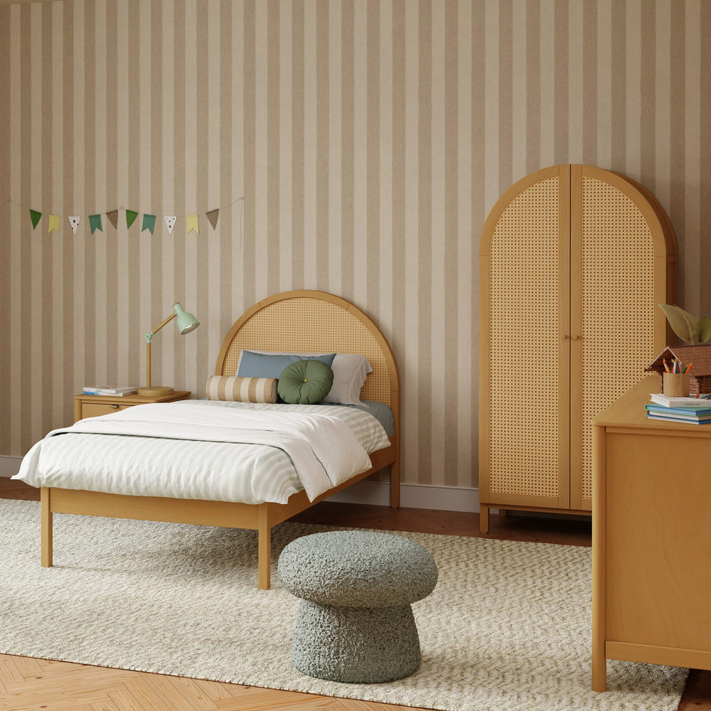 The Bondi Cane Twin Bed features a softly arched headboard with woven cane paneling for a light, airy feel that complements any space—from modern boho to coastal cool. Pair this kids’ twin bed with our matching guardrails for added peace of mind, or add the optional Twin Storage Trundle Bed for sleepovers and secret stashes. The Bondi Cane Twin Bed brings effortless style and thoughtful function to your growing kiddo’s room.