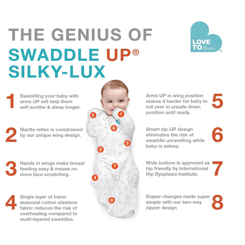 The innovative SWADDLE UP SILKY-LUX™ with patented wings allows babies to sleep in a more natural position, with their ARMS UP™, so they can self-soothe by sucking their hands and touching their face. Medical research has shown that when babies can self-soothe, they sleep longer. The SWADDLE UP™ is intended for use from day one™ and can help parents establish a solid foundation for sleep, right from birth.
