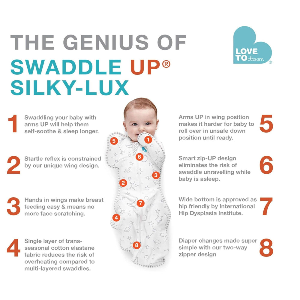 The innovative SWADDLE UP SILKY-LUX™ with patented wings allows babies to sleep in a more natural position, with their ARMS UP™, so they can self-soothe by sucking their hands and touching their face. Medical research has shown that when babies can self-soothe, they sleep longer. The SWADDLE UP™ is intended for use from day one™ and can help parents establish a solid foundation for sleep, right from birth.