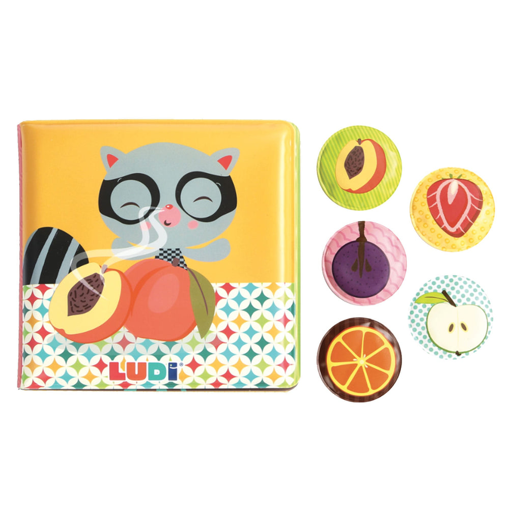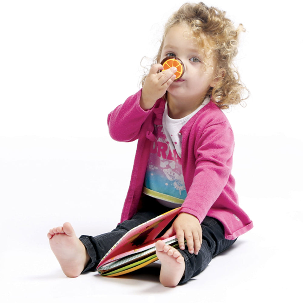 Five little patches representing fruit slices come with the book. By scratching with their finger, the child will smell a fragrance they need to match with the right fruit. They can then put the patch in the right place using velcro. Children will learn all about peaches, oranges, strawberries, apples and grapes. Once they’re done playing, everything goes back into the little pocket at the end of the book.