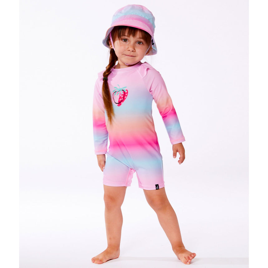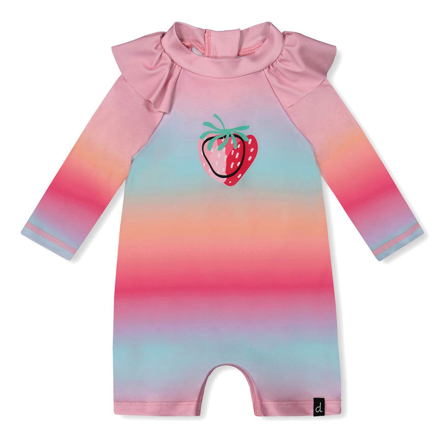 On the beach, she'll look super cute in our pink, orange and turquoise long-sleeved one-piece rash guard. With its gradient print and strawberry pattern on the chest, this swimsuit has long raglan sleeves, a round neck with ruffles and a UV protection factor UPF 50+ to protect your skin from the sun.
