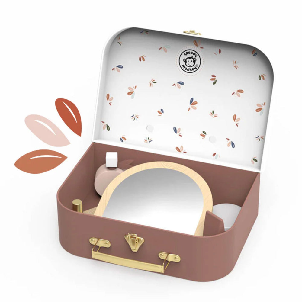Made from FSC-certified wood and painted with non-toxic, child-safe finishes, the Beauty Suitcase combines eco-friendly materials with durability. Its compact, portable design makes it ideal for at-home play or taking along on trips. The mirror can be easily set up by fitting it into the designated slots on the lid, adding an extra touch of realism to playtime.