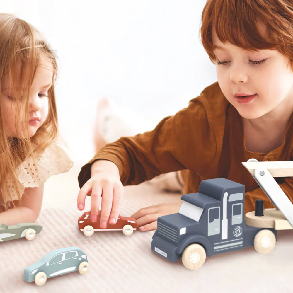 This wooden car transporter truck toy has a double-deck trailer. It easily converts for loading and unloading.