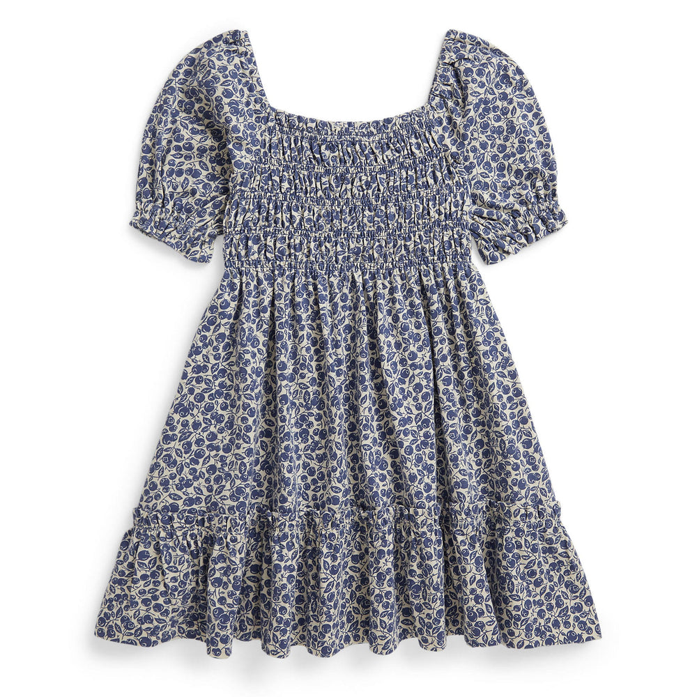 Inspired by the laid-back charm of the New England coast, this cotton jersey dress features a smocked bodice, ruffles, and an adorable blueberry print.