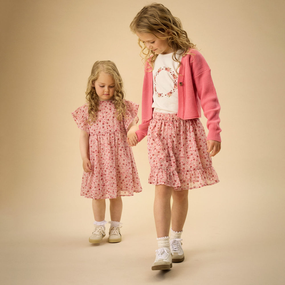 All-over-printet dress from Creamie made in chiffon. This dress has short sleeves and gathers at the waist and sleeves.