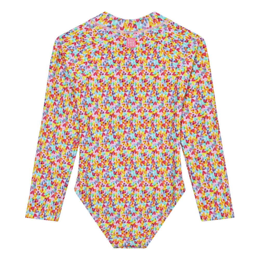 OEKO-TEX® STANDARD 100 Cert. No. 2276-364 DTI, Tested to UV STANDARD 801 UPF 60+ Long-sleeved swimsuit from Color Kids. The swimsuit has an all-over print. It closes with a front zipper and has a small fabric guard at the collar for extra comfort. Certified acc. to OEKO-TEX® STANDARD 100 Cert. No. 2276-364 DTI Tested and certified acc. to UPF 60+. To determine the UPF rating, the fabric is tested in both new and used conditions, following the UV STANDARD 801 method. The entire product is then CE-certified under PPE regulations.