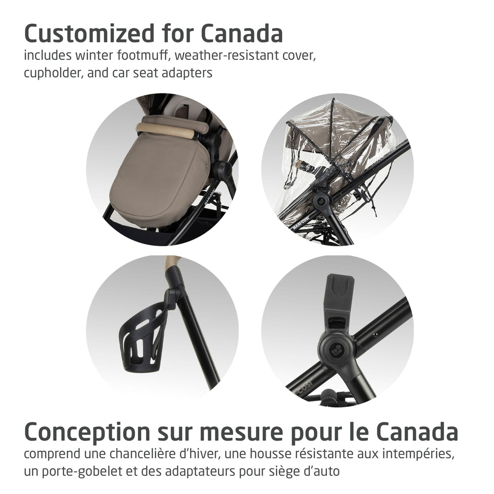 -Designed for Canada: Larger wheels for walks in the city or countryside, including a weather shield and an insulated foot cover to keep your child warm.