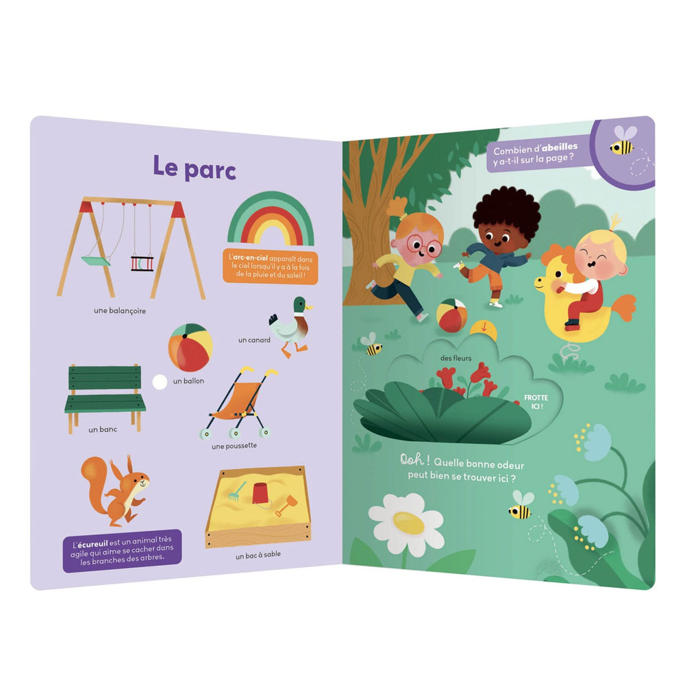 Dans ce beau livre, le tout-petit découvre ses premiers mots avec 9 univers thématiques adaptés (la ferme, la crèche, la cuisine, la mer...), un imagier en page de gauche et une belle et grande illustration en page de droite.Sur chaque double-page, un grand flap à soulever pour découvrir une odeur cachée et liée à l'univers de l'illustration !Le sens olfactif permet une découverte ludique et facilite l’appropriation du nouveau vocabulaire et sa mémorisation. Pointer, nommer, enrichir son vocabulaire et développer son odorat : un livre d’éveil à manipuler d’abord avec le parent accompagnateur, puis tout seul.