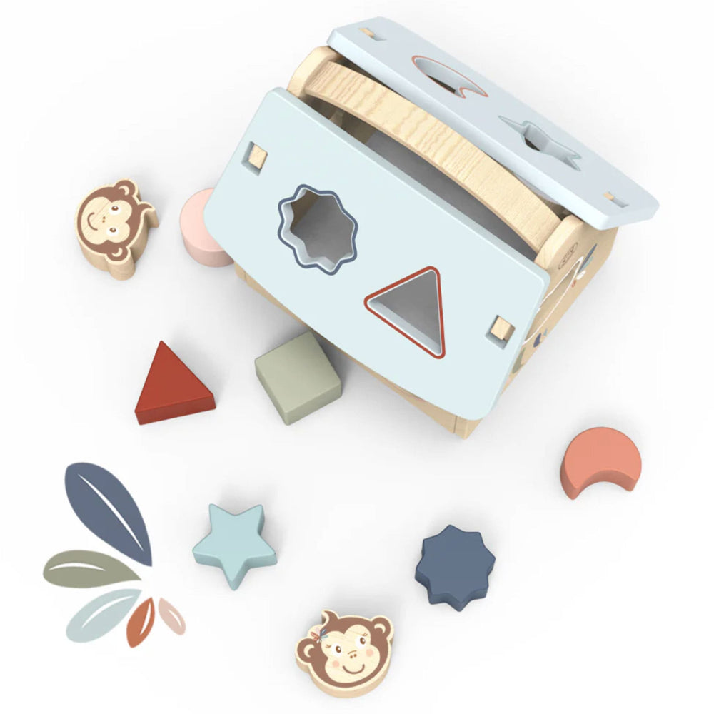 - This house shape sorter will fascinate your little one with its different colors, shapes, and favorite character: the monkey