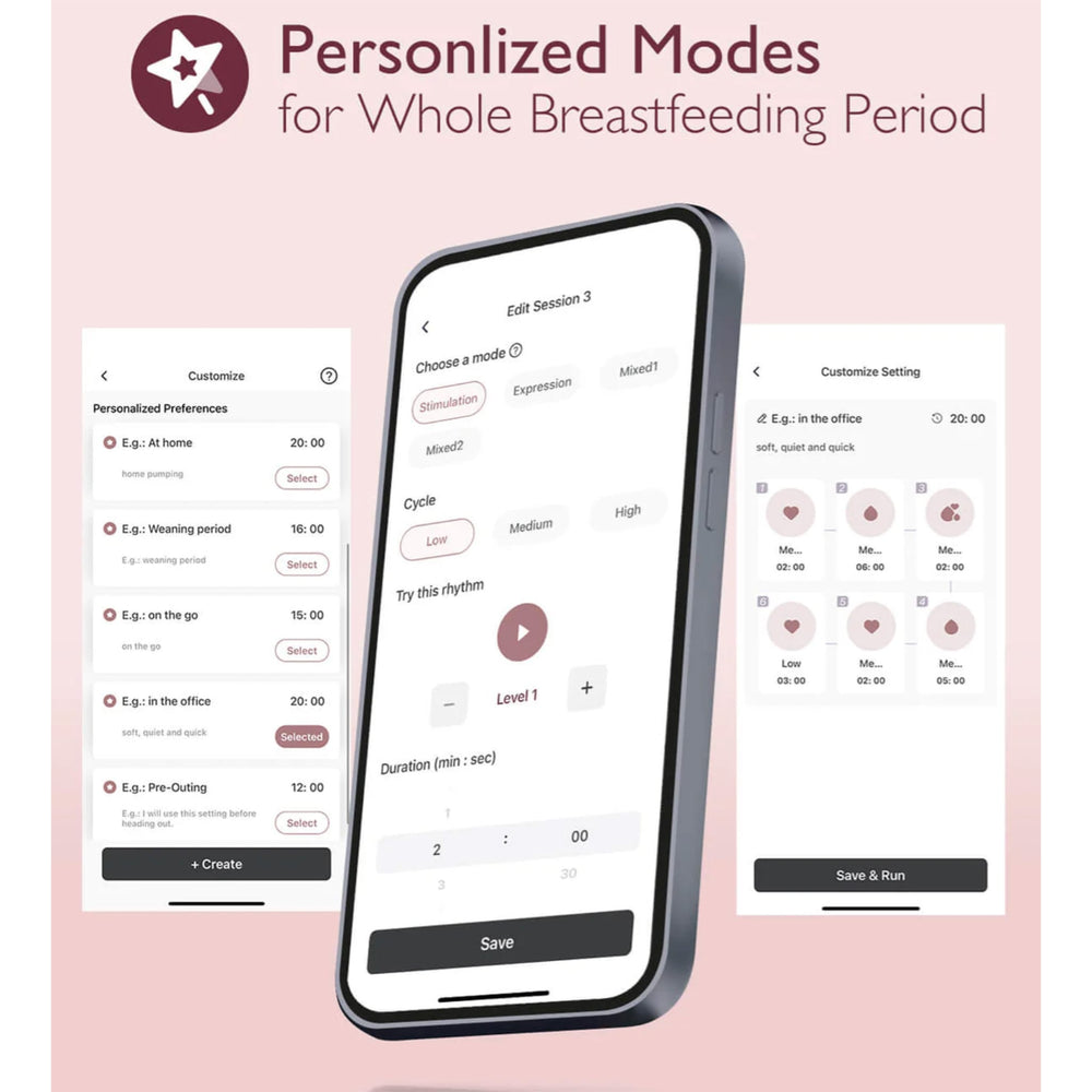 Personalize patterns via the Momcozy app, adjusting mode and intensity to suit your comfort and preference